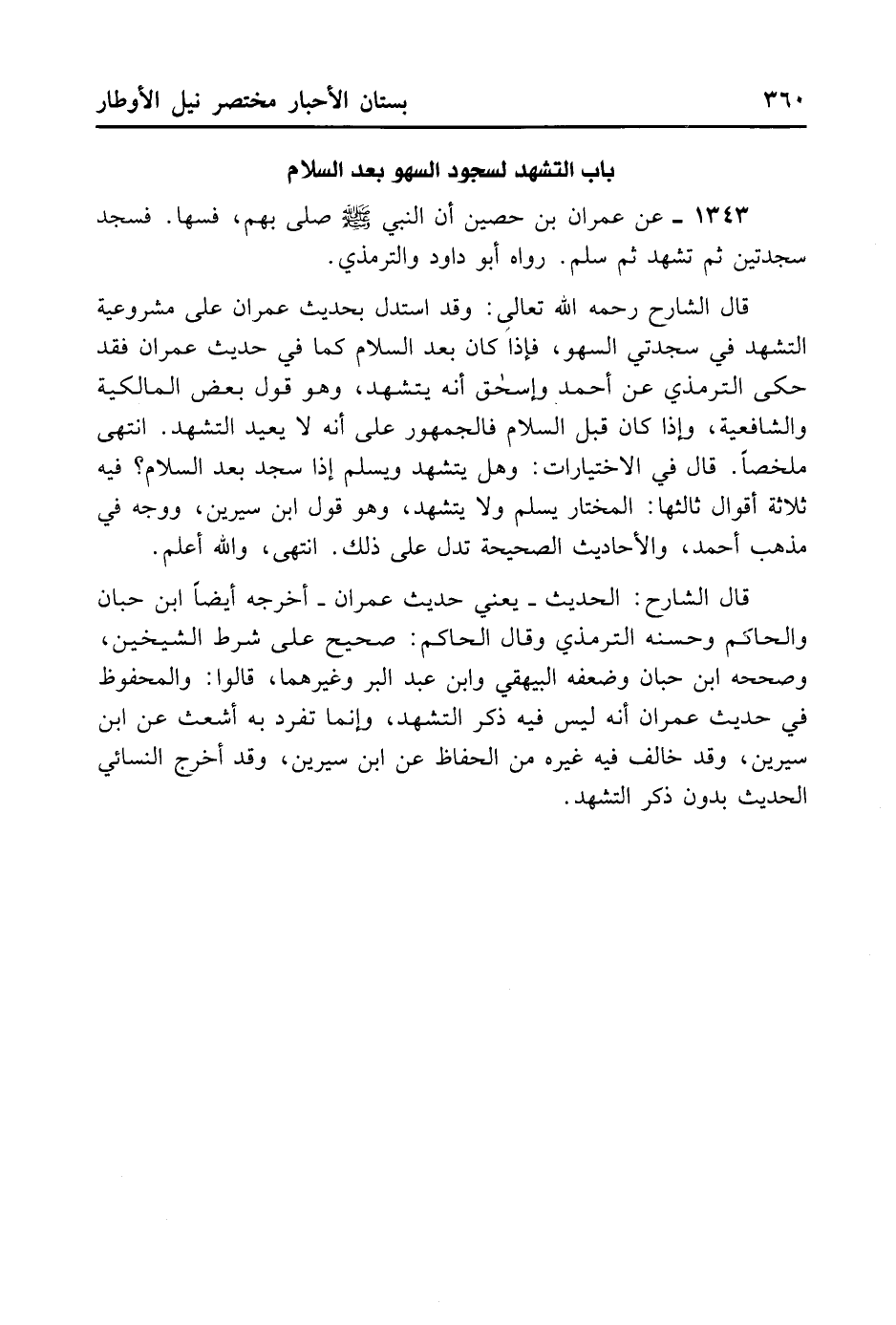 قَالَ الشَّارِحُ: الْحَدِيثُ - يَعْنِي حَدِيثَ عِمْرَانَ - أَخْرَجَهُ أَيْضًا ابْنُ حِبَّانٍ وَالْحَاكِمُ وَحَسَّنَهُ التّرْمِذِيُّ وَقَالَ الْحَاكِمُ: صَحِيحٌ عَلَى شَرْطِ الشَّيْخَيْنِ وَصَحَّحَهُ ابْنُ حِبَّانٍ وَضَعَّفَهُ الْبَيْهَقِي وَابْنُ عَبْدِ الْبَرِّ وَغَيْرِهِمَا. قَالُوا: وَالْمَحْفُوظُ فِي حَدِيثِ عِمْرَانٍ أَنَّهُ لَيْسَ فِيهِ ذِكْرُ التَّشَهُّدَ وَإِنَّمَا تَفَرَّدَ بِهِ أَشْعَثُ عَنِ ابْنِ سِيرِين، وَقَدْ خَالَفَ فِيهِ غَيْرُهُ مِنَ الْحُفَّاظِ عَنِ ابْنِ سِيرِين. وَقَدْ أَخْرَجَ النَّسَائِيِ الْحَدِيثِ بِدُونِ ذِكْرِ التَّشَهُّدِ.
