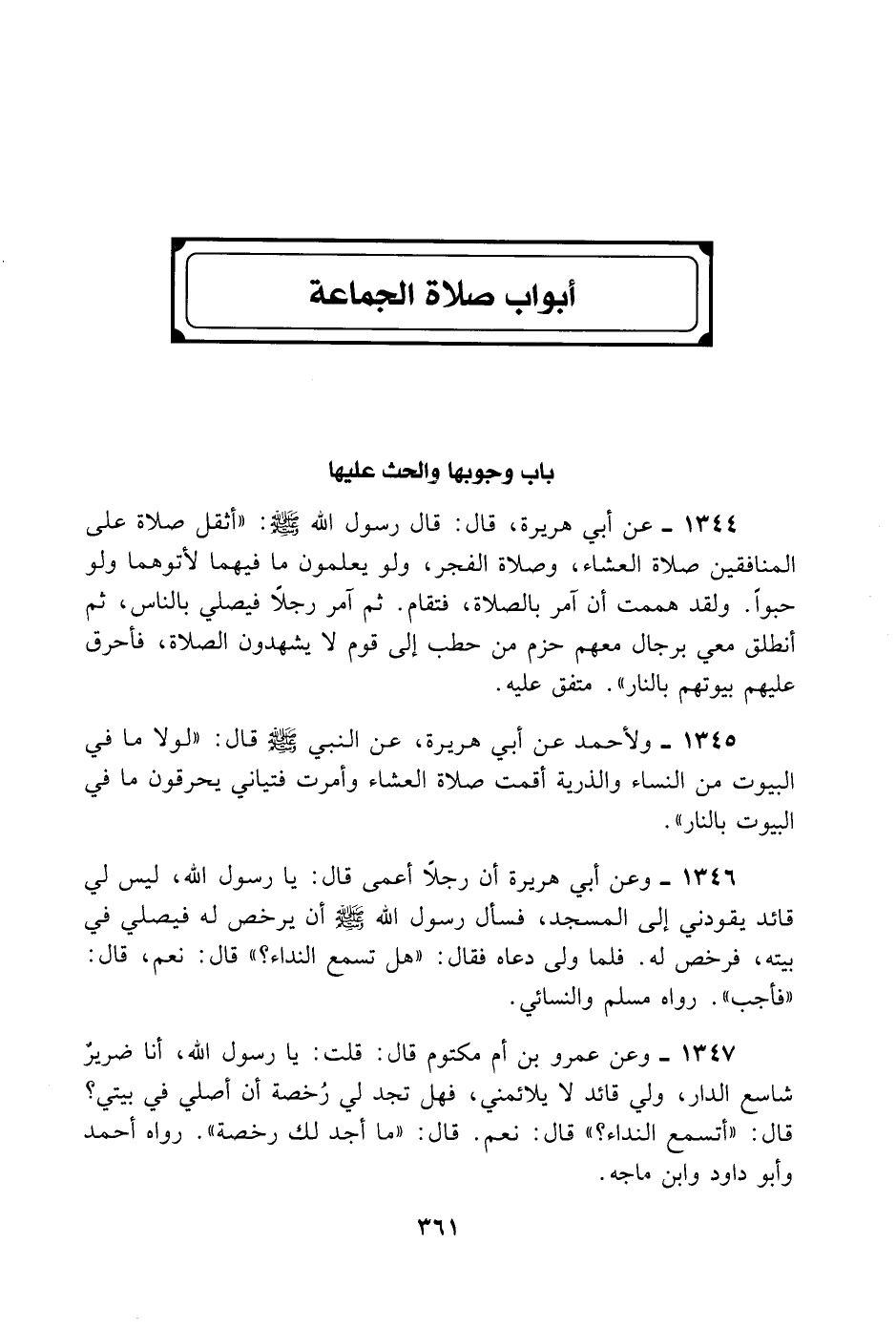 1344- عَنْ أَبِي هُرَيْرَةَ قَالَ: قَالَ رَسُولُ اللَّهِ - صلى الله عليه وسلم -: «أَثْقَلُ الصَّلَاةِ عَلَى الْمُنَافِقِينَ صَلَاةُ الْعِشَاءِ وَصَلَاةُ الْفَجْرِ، وَلَوْ يَعْلَمُونَ مَا فِيهِمَا لَأَتَوْهُمَا وَلَوْ حَبْوًا، وَلَقَدْ هَمَمْتُ أَنْ آمُرَ بِالصَّلَاةِ فَتُقَامَ، ثُمَّ آمُرَ رَجُلًا فَيُصَلِّيَ بِالنَّاسِ، ثُمَّ أَنْطَلِقَ مَعِي بِرِجَالٍ مَعَهُمْ حُزَمٌ مِنْ حَطَبٍ إلَى قَوْمٍ لَا يَشْهَدُونَ الصَّلَاةَ فَأُحَرِّقَ عَلَيْهِمْ بُيُوتَهُمْ بِالنَّارِ» . مُتَّفَقٌ عَلَيْهِ.