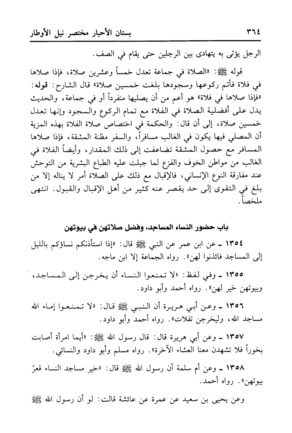 1358- وَعَنْ أُمِّ سَلَمَةَ أَنَّ رَسُولَ اللَّهِ - صلى الله عليه وسلم - قَالَ: «خَيْرُ مَسَاجِدِ النِّسَاءِ قَعْرُ بُيُوتِهِنَّ» . رَوَاهُ أَحْمَدُ.
