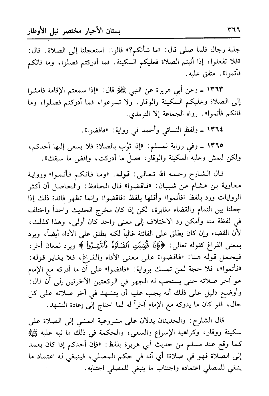 1365- وَفِي رِوَايَةٍ لِمُسْلِمٍ: «إذَا ثُوِّبَ بِالصَّلَاةِ فَلَا يَسْعَى إلَيْهَا أَحَدُكُمْ، وَلَكِنْ لِيَمْشِ وَعَلَيْهِ السَّكِينَةُ وَالْوَقَارُ، فَصَلِّ مَا أَدْرَكْتَ، وَاقْضِ مَا سَبَقَكَ» .