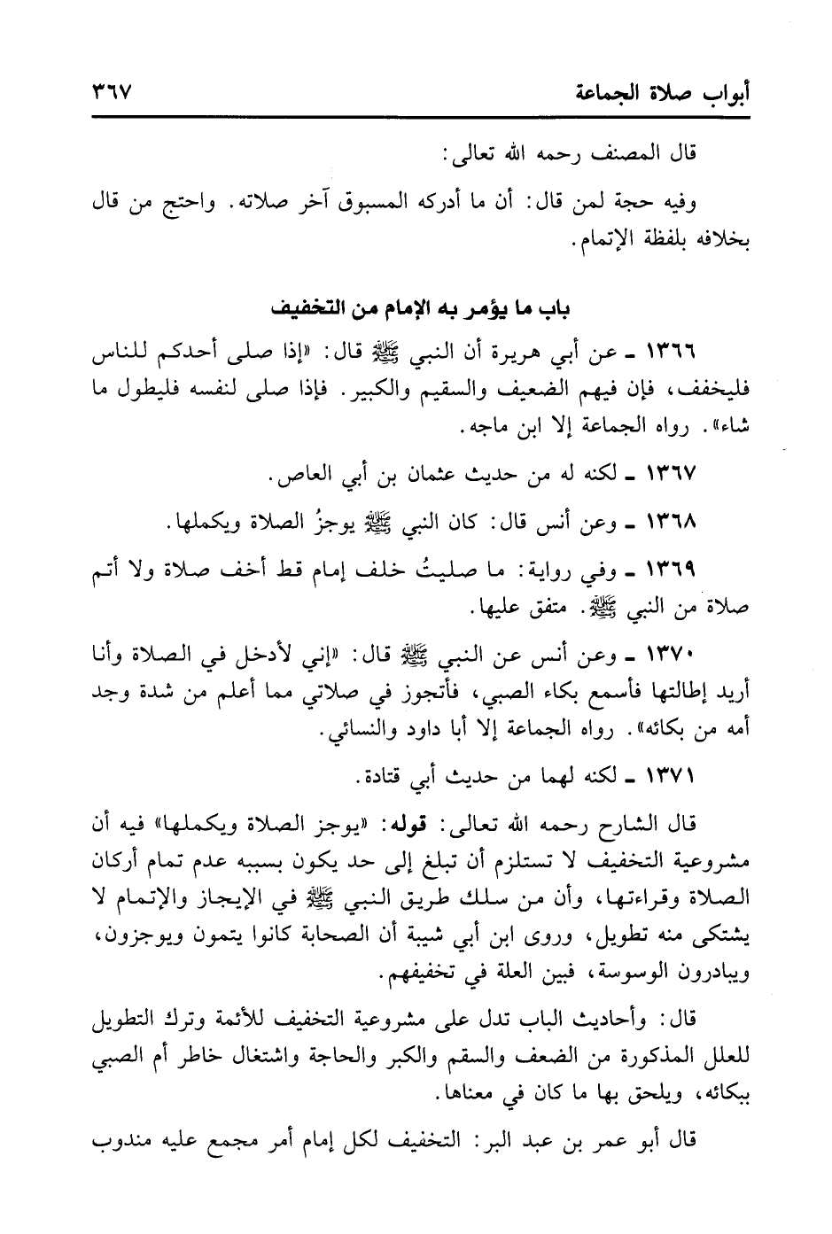 1366- عَنْ أَبِي هُرَيْرَةَ أَنَّ النَّبِيَّ - صلى الله عليه وسلم - قَالَ: «إذَا صَلَّى أَحَدُكُمْ لِلنَّاسِ فَلْيُخَفِّفْ، فَإِنَّ فِيهِمْ الضَّعِيفَ وَالسَّقِيمَ وَالْكَبِيرَ. فَإِذَا صَلَّى لِنَفْسِهِ فَلْيُطَوِّلْ مَا شَاءَ» . رَوَاهُ الْجَمَاعَةُ إلَّا ابْنَ مَاجَهْ.