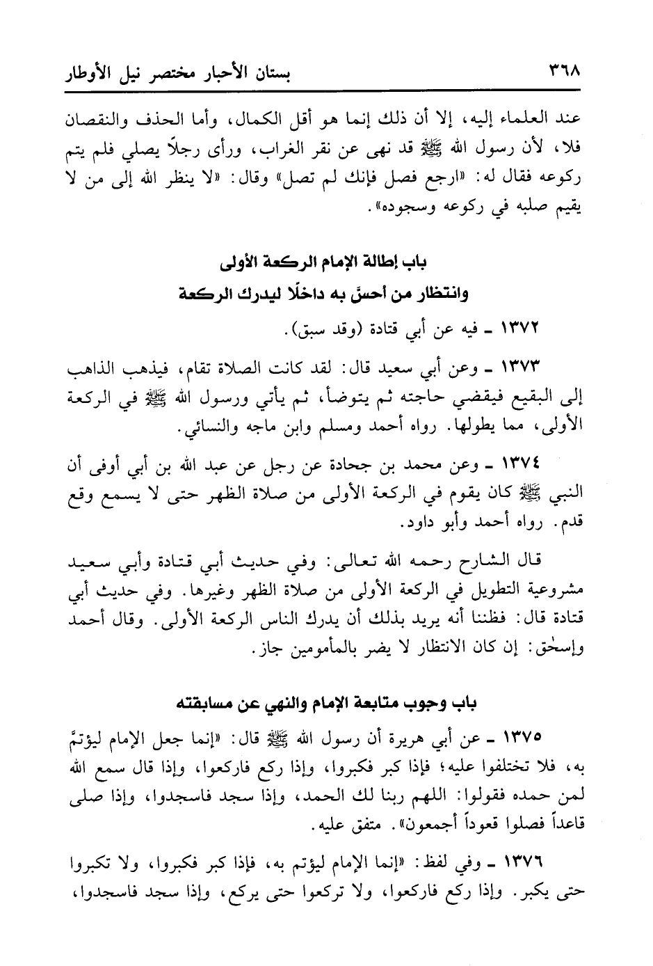 1373- عَنْ أَبِي سَعِيدٍ قَال: لَقَدْ كَانَتْ الصَّلَاةُ تُقَامُ فَيَذْهَبُ الذَّاهِبُ إلَى الْبَقِيعِ فَيَقْضِي حَاجَتَهُ، ثُمَّ يَتَوَضَّأُ، ثُمَّ يَأْتِي وَرَسُولُ اللَّهِ - صلى الله عليه وسلم - فِي الرَّكْعَةِ الْأُولَى مِمَّا يُطَوِّلُهَا. رَوَاهُ أَحْمَدُ وَمُسْلِمٌ وَابْنُ مَاجَهْ وَالنَّسَائِيُّ.