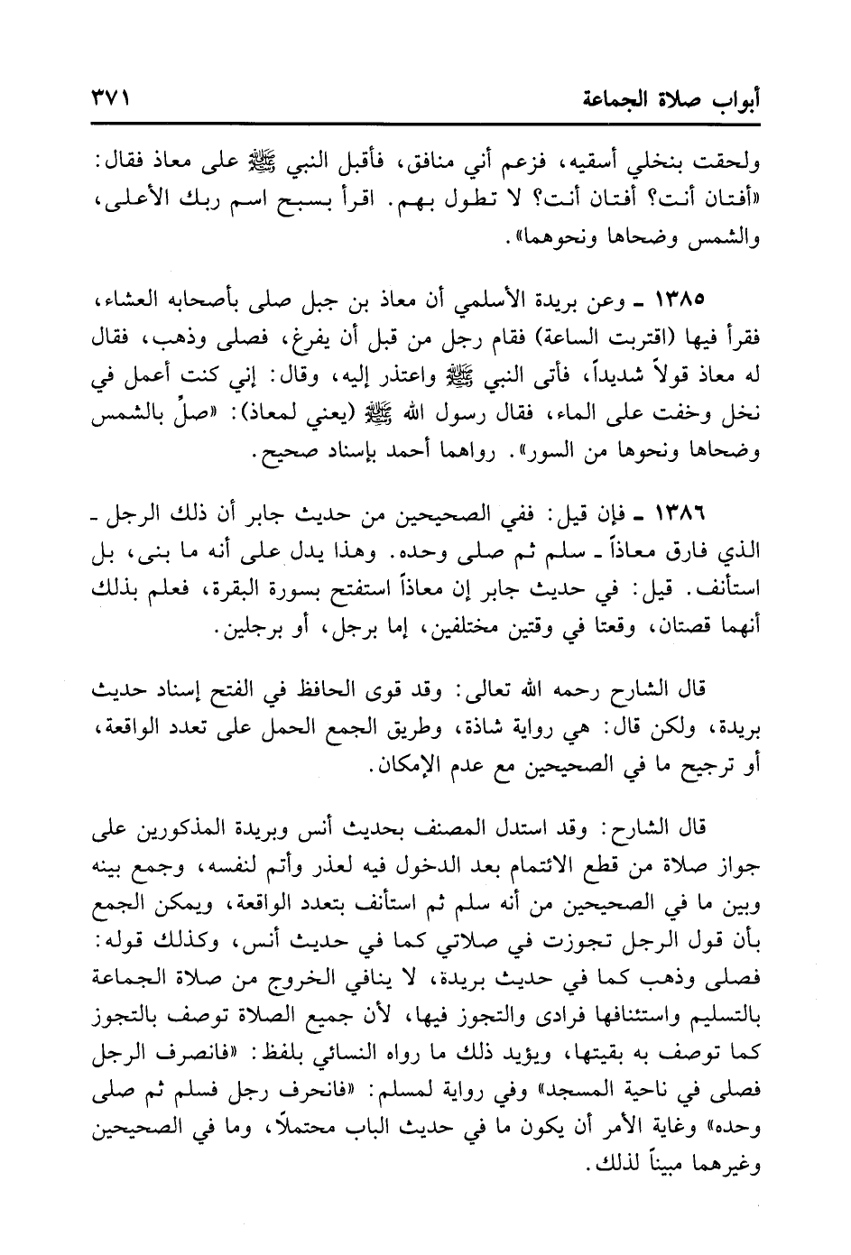 قَالَ الشَّارِحُ: وَقَدْ اسْتَدَلَّ الْمُصَنِّفُ بِحَدِيثِ أَنَسٍ وَبُرَيْدَةَ الْمَذْكُورَيْنِ عَلَى جَوَازِ صَلَاةِ مَنْ قَطَعَ الِائْتِمَامَ بَعْدَ الدُّخُولِ فِيهِ لِعُذْرٍ وَأَتَمَّ لِنَفْسِهِ. وَجُمِعَ بَيْنَهُ وَبَيْنَ مَا فِي الصَّحِيحَيْنِ مِنْ أَنَّهُ سَلَّمَ ثُمَّ اسْتَأْنَفَ بِتَعَدُّدِ الْوَاقِعَةِ. وَيُمْكِنُ الْجَمْعُ بِأَنَّ قَوْلَ الرَّجُلِ: تَجَوَّزْتُ فِي صَلَاتِي كَمَا فِي حَدِيثِ أَنَسٍ، وَكَذَلِكَ قَوْلُهُ: فَصَلَّى وَذَهَبَ كَمَا فِي حَدِيثِ بُرَيْدَةَ لَا يُنَافِي الْخُرُوجُ مِنْ صَلَاةِ الْجَمَاعَةِ بِالتَّسْلِيمِ وَاسْتِئْنَافِهَا فُرَادَى وَالتَّجَوُّزِ فِيهَا، لِأَنَّ جَمِيعَ الصَّلَاةِ تُوصَفُ بِالتَّجَوُّزِ كَمَا تُوصَفُ بِهِ بَقِيَّتُهَا. وَيُؤَيِّدُ ذَلِكَ مَا رَوَاهُ النَّسَائِيّ بِلَفْظِ: فَانْصَرَفَ الرَّجُلُ فَصَلَّى فِي نَاحِيَةِ الْمَسْجِدِ. وَفِي رِوَايَةٍ لِمُسْلِمٍ: فَانْحَرَفَ رَجُلٌ فَسَلَّمَ ثُمَّ صَلَّى وَحْدَهُ. وَغَايَةُ الْأَمْرِ أَنْ يَكُونَ مَا فِي حَدِيثَيْ الْبَابِ مُحْتَمَلًا، وَمَا فِي الصَّحِيحَيْنِ وَغَيْرِهِمَا مُبَيِّنًا لِذَلِكَ.
