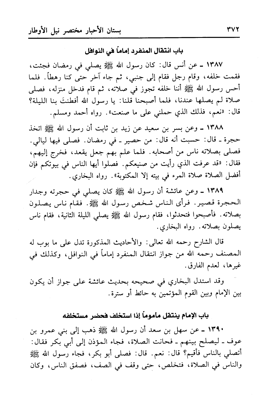 1387- عَنْ أَنَسٍ قَالَ: كَانَ رَسُولُ اللَّهِ - صلى الله عليه وسلم - يُصَلِّي فِي رَمَضَانَ فَجَئْتُ فَقُمْتُ خَلْفَهُ، وَقَامَ رَجُلٌ فَقَامَ إلَى جَنْبِي، ثُمَّ جَاءَ آخَرُ حَتَّى كُنَّا رَهْطًا، فَلَمَّا أَحَسَّ رَسُولُ اللَّهِ - صلى الله عليه وسلم - أَنَّنَا خَلْفَهُ تَجَوَّزَ فِي صَلَاتِهِ، ثُمَّ قَامَ فَدَخَلَ مَنْزِلَهُ فَصَلَّى صَلَاةً لَمْ يُصَلِّهَا عِنْدَنَا، فَلَمَّا أَصْبَحْنَا قُلْنَا: يَا رَسُولَ اللَّهِ أَفَطِنْتَ بِنَا اللَّيْلَةَ؟ قَالَ: «نَعَمْ، فَذَلِكَ الَّذِي حَمَلَنِي عَلَى مَا صَنَعْتُ» . رَوَاهُ أَحْمَدُ وَمُسْلِمٌ.