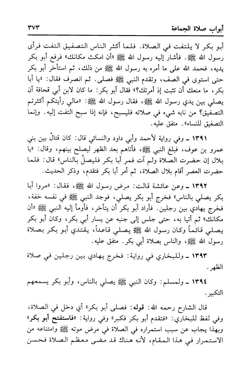 1391- وَفِي رِوَايَةٍ لِأَحْمَدَ وَأَبِي دَاوُد وَالنَّسَائِيُّ قَالَ: كَانَ قِتَالٌ بَيْنَ بَنِي عَمْرِو بْنِ عَوْفٍ، فَبَلَغَ النَّبِيَّ - صلى الله عليه وسلم - فَأَتَاهُمْ بَعْدَ الظُّهْرِ لِيُصْلِحَ بَيْنَهُمْ وَقَالَ: يَا بِلَالُ إنْ حَضَرَتْ الصَّلَاةُ وَلَمْ آتِ فَمُرْ أَبَا بَكْرٍ فَلْيُصَلِّ بِالنَّاسِ، قَالَ: فَلَمَّا حَضَرَتْ الْعَصْرُ أَقَامَ بِلَالٌ الصَّلَاةَ، ثُمَّ أَمَرَ أَبَا بَكْرٍ فَتَقَدَّمَ وَذَكَرَ الْحَدِيثَ.