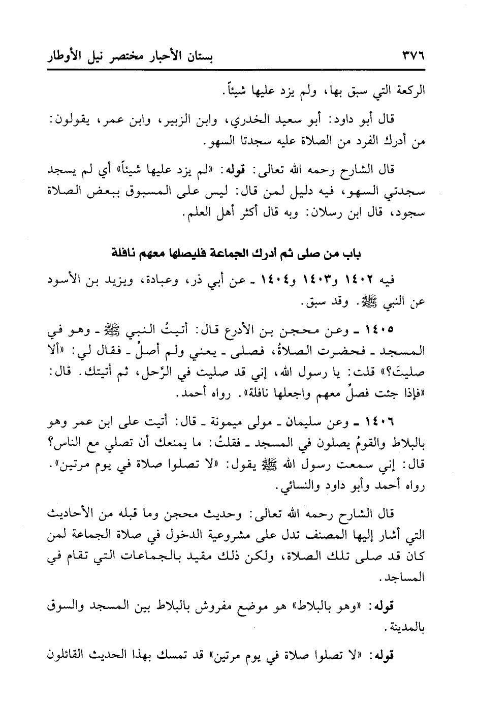 1406- وَعَنْ سُلَيْمَانَ مَوْلَى مَيْمُونَةَ قَالَ: أَتَيْتُ عَلَى ابْنِ عُمَرَ وَهُوَ بِالْبَلَاطِ وَالْقَوْمُ يُصَلُّونَ فِي الْمَسْجِدِ، فَقُلْتُ: مَا يَمْنَعُكَ أَنْ تُصَلِّيَ مَعَ النَّاسِ؟ قَالَ: