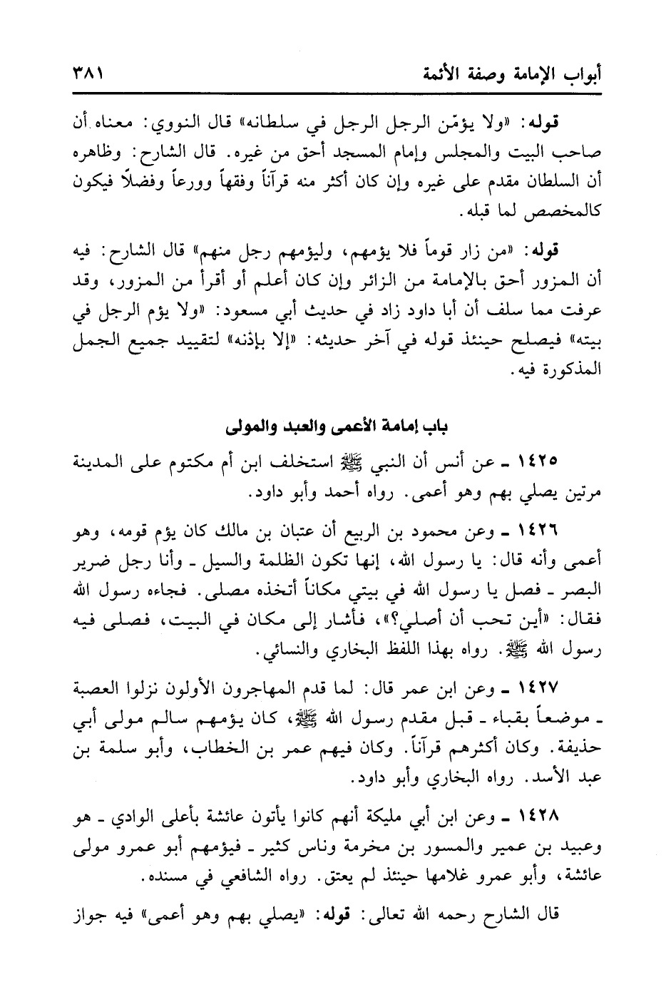 1426- وَعَنْ مَحْمُودِ بْنِ الرَّبِيعِ أَنَّ عِتْبَانُ بْنَ مَالِكٍ كَانَ يَؤُمُّ قَوْمَهُ وَهُوَ أَعْمَى، وَأَنَّهُ قَالَ: يَا رَسُولَ اللَّهِ إنَّهَا تَكُونُ الظُّلْمَةُ وَالسَّيْلُ وَأَنَا رَجُلٌ ضَرِيرُ الْبَصَرِ، فَصَلِّ يَا رَسُولَ اللَّهِ فِي بَيْتِي مَكَانًا أَتَّخِذُهُ مُصَلًّى فَجَاءَ رَسُولُ اللَّهِ - صلى الله عليه وسلم - فَقَالَ: «أَيْنَ تُحِبُّ أَنْ أُصَلِّيَ» . فَأَشَارَ إلَى مَكَان فِي الْبَيْتِ فَصَلَّى فِيهِ رَسُولُ اللَّهِ - صلى الله عليه وسلم -. رَوَاهُ بِهَذَا اللَّفْظِ الْبُخَارِيُّ وَالنَّسَائِيُّ.