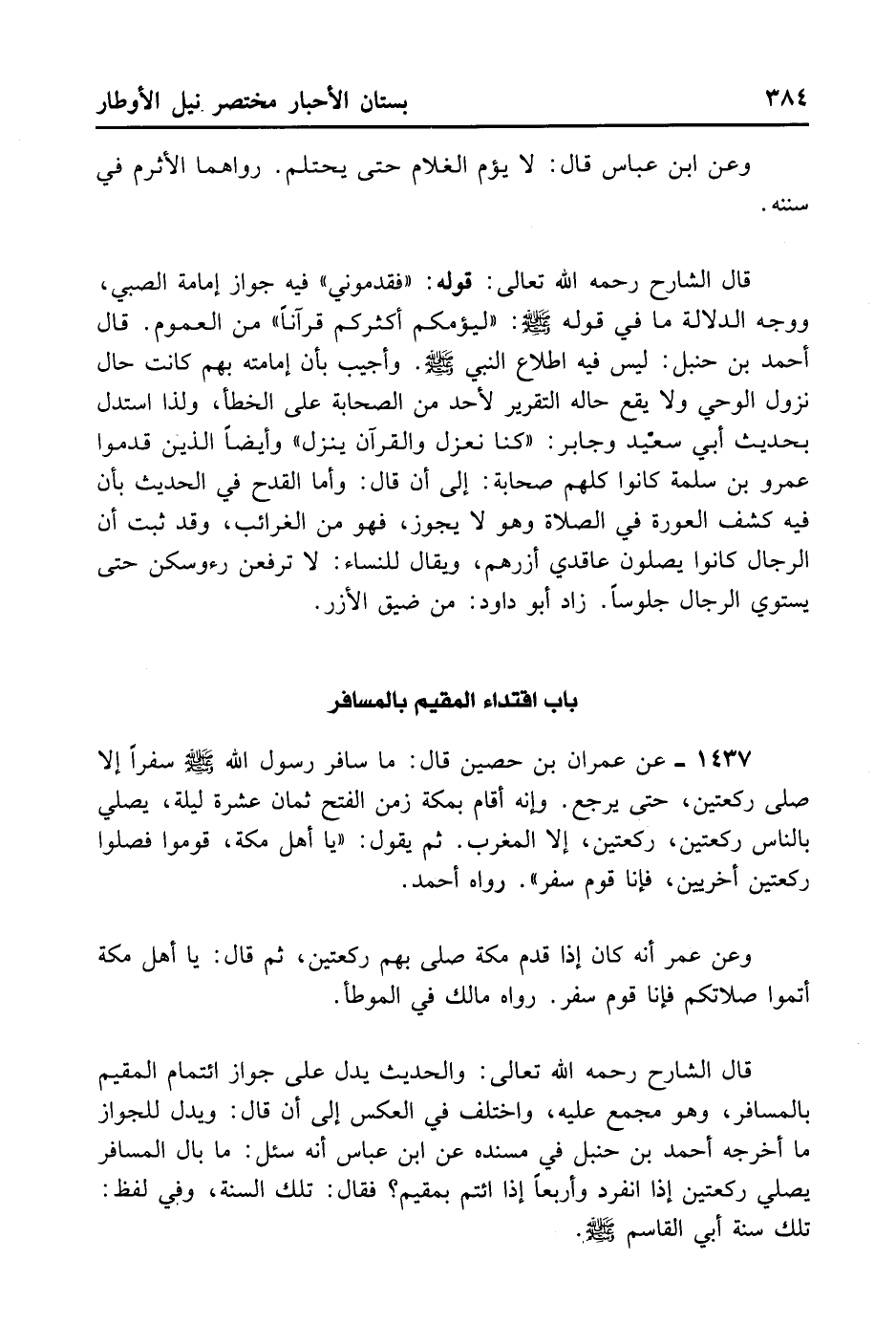 1437- عَنْ عِمْرَانَ بْنِ حُصَيْنٍ قَالَ: مَا سَافَرَ رَسُولُ اللَّهِ - صلى الله عليه وسلم - سَفَرًا إلَّا صَلَّى رَكْعَتَيْنِ حَتَّى يَرْجِعَ، وَإِنَّهُ أَقَامَ بِمَكَّةَ زَمَنَ الْفَتْحِ ثَمَانِ عَشْرَةَ لَيْلَةً يُصَلِّي بِالنَّاسِ رَكْعَتَيْنِ رَكْعَتَيْنِ إلَّا الْمَغْرِبَ، ثُمَّ يَقُولُ: يَا أَهْلَ مَكَّةَ قُومُوا فَصَلُّوا رَكْعَتَيْنِ أُخْرَيَيْنِ فَإِنَّا قَوْمٌ سَفْرٌ. رَوَاهُ أَحْمَدُ.