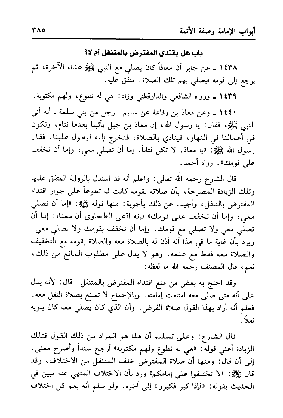 1438- عَنْ جَابِرٍ أَنَّ مُعَاذًا كَانَ يُصَلِّي مَعَ النَّبِيِّ - صلى الله عليه وسلم - عِشَاءَ الْآخِرَةِ، ثُمَّ يَرْجِعُ إلَى قَوْمِهِ فَيُصَلِّي بِهِمْ تِلْكَ الصَّلَاةَ. مُتَّفَقٌ عَلَيْهِ.