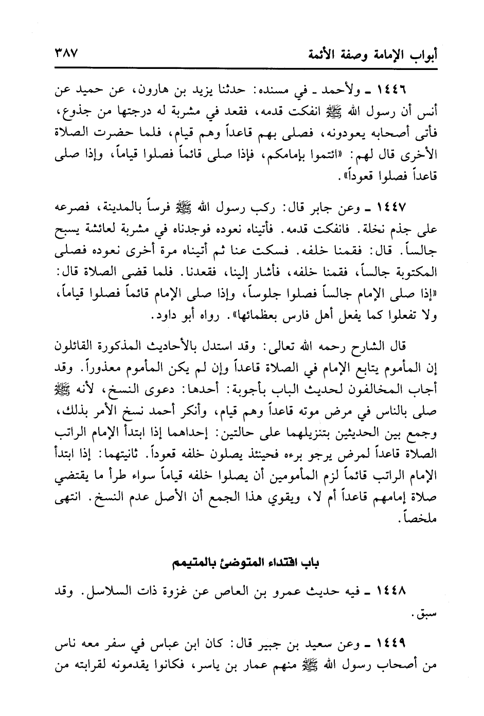 1446- وَلِأَحْمَدَ فِي مُسْنَده: حَدَّثَنَا يَزِيدُ بْنُ هَارُونَ عَنْ حُمَيْدٍ عَنْ أَنَسٍ: أَنَّ رَسُولَ اللَّهِ - صلى الله عليه وسلم - انْفَكَّتْ قَدَمُهُ، فَقَعَدَ فِي مَشْرُبَةٍ لَهُ دَرَجَتُهَا مِنْ جُذُوعٍ، فَأَتَى أَصْحَابُهُ يَعُودُونَهُ، فَصَلَّى بِهِمْ قَاعِدًا وَهُمْ قِيَامٌ، فَلَمَّا حَضَرَتْ الصَّلَاةُ الْأُخْرَى قَالَ لَهُمْ: «ائْتَمُّوا بِإِمَامِكُمْ، فَإِذَا صَلَّى قَائِمًا فَصَلُّوا قِيَامًا، وَإِذَا صَلَّى قَاعِدًا فَصَلُّوا قُعُودًا» .