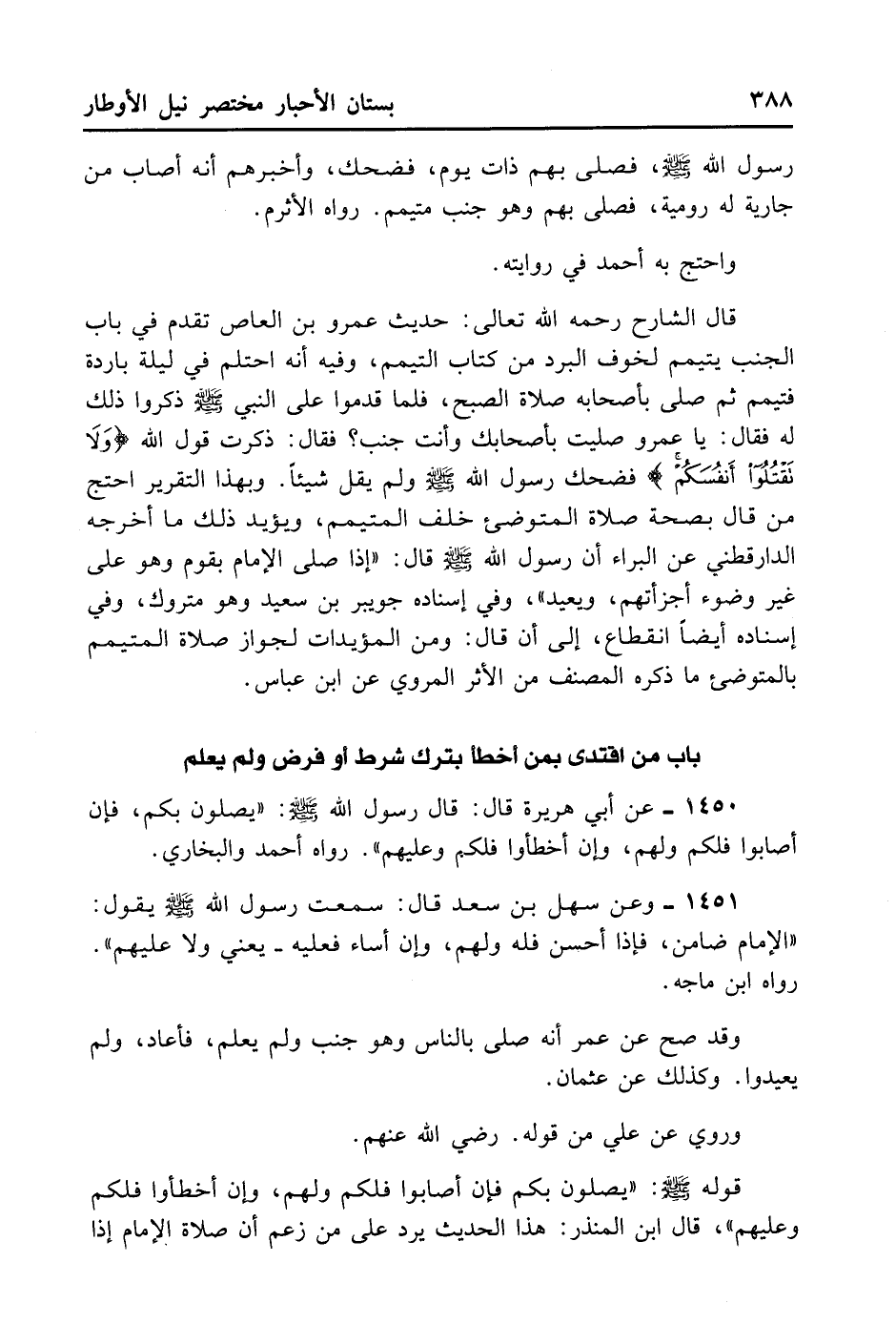رَسُولِ اللَّهِ - صلى الله عليه وسلم -، فَصَلَّى بِهِمْ ذَاتَ يَوْمٍ، فَضَحِكَ وَأَخْبَرَهُمْ أَنَّهُ أَصَابَ مِنْ جَارِيَةٍ لَهُ رُومِيَّةٍ، فَصَلَّى بِهِمْ وَهُوَ جُنُبٌ مُتَيَمِّمٌ. رَوَاهُ الْأَثْرَم.