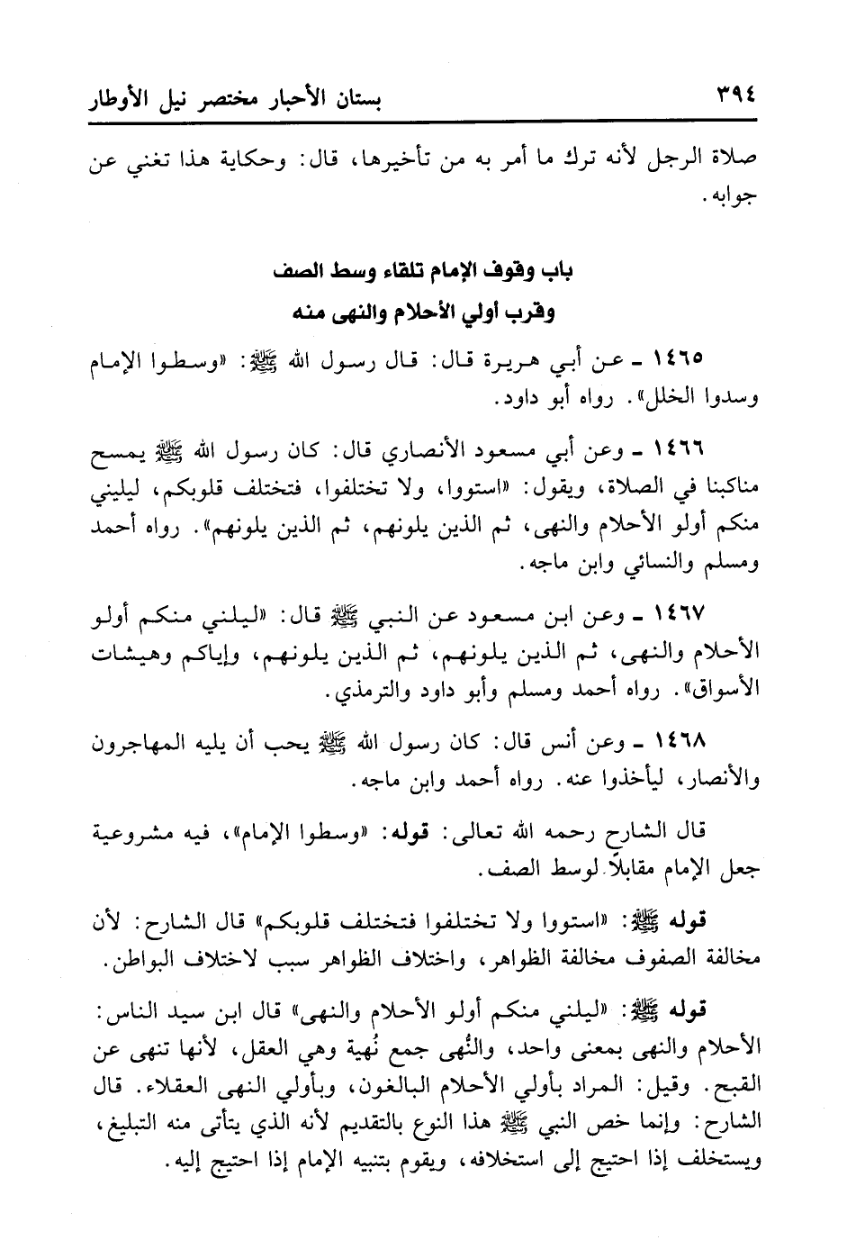 1466- وَعَنْ أَبِي مَسْعُود الْأَنْصَارِيِّ قَالَ: كَانَ رَسُولُ اللَّهِ - صلى الله عليه وسلم - يَمْسَحُ مَنَاكِبَنَا فِي الصَّلَاةِ وَيَقُولُ: «اسْتَوُوا وَلَا تَخْتَلِفُوا فَتَخْتَلِفَ قُلُوبُكُمْ، لِيَلِيَنِّي مِنْكُمْ أُولُو الْأَحْلَامِ وَالنُّهَى، ثُمَّ الَّذِينَ يَلُونَهُمْ، ثُمَّ الَّذِينَ يَلُونَهُمْ» . رَوَاهُ أَحْمَدُ وَمُسْلِمٌ وَالنَّسَائِيُّ وَابْنُ مَاجَهْ.