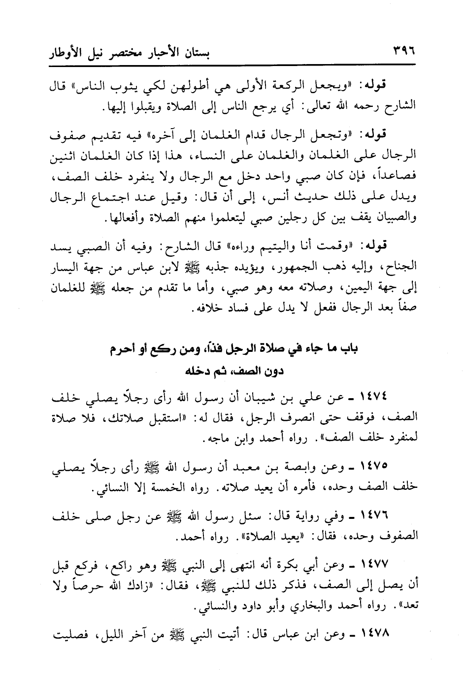 1474- عَنْ عَلِيِّ بْنِ شَيْبَانُ أَنَّ رَسُولَ اللَّهِ - صلى الله عليه وسلم - رَأَى رَجُلًا يُصَلِّي خَلْفَ الصَّفِّ فَوَقَفَ حَتَّى انْصَرَفَ الرَّجُلُ، فَقَالَ لَهُ: اسْتَقْبِلْ صَلَاتَكَ، فَلَا صَلَاةَ لِمُنْفَرِدٍ خَلْفَ الصَّفِّ. رَوَاهُ أَحْمَدُ وَابْنُ مَاجَهْ.