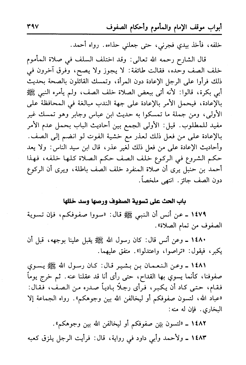1481- وَعَنْ النُّعْمَانِ بْنِ بَشِيرٍ قَالَ: كَانَ رَسُولُ اللَّهِ - صلى الله عليه وسلم - يُسَوِّي صُفُوفَنَا كَأَنَّمَا يُسَوِّي بِهِ الْقِدَاحَ حَتَّى رَأَى أَنَّا قَدْ عَقَلْنَا عَنْهُ، ثُمَّ خَرَجَ يَوْمًا فَقَامَ حَتَّى كَادَ أَنْ يُكَبِّرَ فَرَأَى رَجُلًا بَادِيًا صَدْرُهُ مِنْ الصَّفِّ، فَقَالَ: عِبَادَ اللَّهِ لَتُسَوُّنَّ صُفُوفَكُمْ أَوْ لَيُخَالِفَنَّ اللَّهُ بَيْنَ وُجُوهِكُمْ» . رَوَاهُ الْجَمَاعَة إلَّا الْبُخَارِيَّ فَإِنَّ لَهُ مِنْهُ.