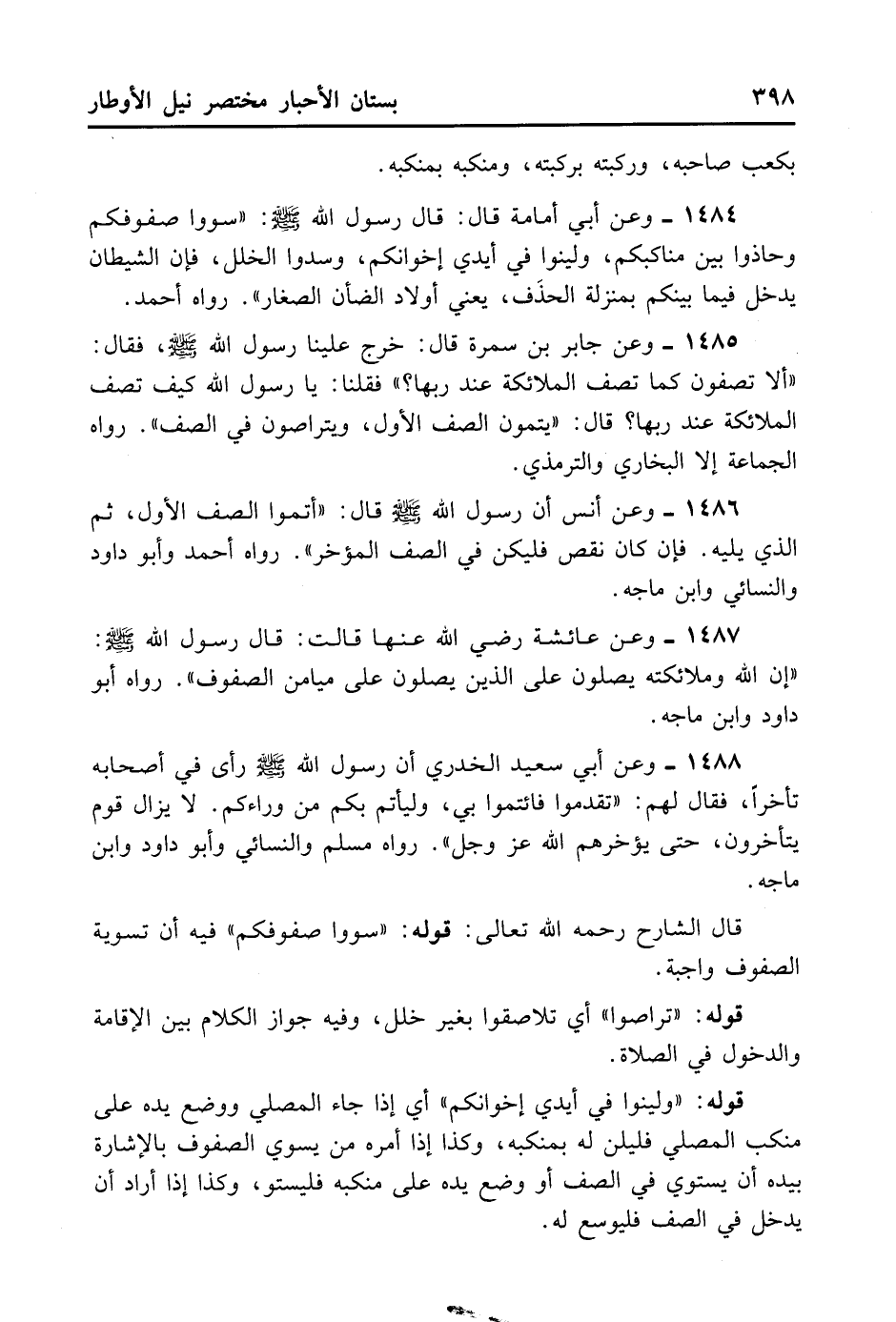 1484- وَعَنْ أَبِي أُمَامَةَ قَالَ: قَالَ رَسُول اللَّه: «سَوُّوا صُفُوفَكُمْ، وَحَاذُوا بَيْنَ مَنَاكِبِكُمْ، وَلِينُوا فِي أَيْدِي إخْوَانِكُمْ، وَسُدُّوا الْخَلَلَ، فَإِنَّ