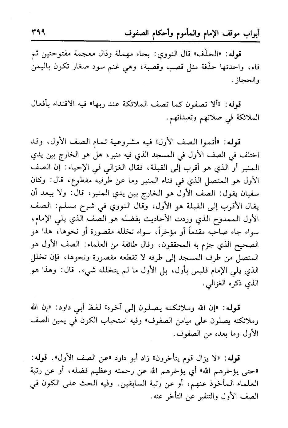 قَوْلُهُ: «أَتِمُّوا الصَّفَّ الْأَوَّل» فِيهِ مَشْرُوعِيَّةُ تَمَام الصَّفّ الْأَوَّل. وَقَدْ اُخْتُلِفَ فِي الصَّفّ الْأَوَّل فِي الْمَسْجِد الَّذِي فِيهِ مِنْبَر، هَلْ هُوَ الْخَارِج بَيْن يَدَيْ الْمِنْبَر، أَوْ الَّذِي هُوَ أَقْرَب إلَى الْقِبْلَة؟ فَقَالَ الْغَزَالِيّ فِي الْإِحْيَاء: إنَّ الصَّفّ الْأَوَّل هُوَ الْمُتَّصِل الَّذِي فِي فِنَاء الْمِنْبَر وَمَا عَنْ طَرَفَيْهِ مَقْطُوع. قَالَ: وَكَانَ سُفْيَانُ يَقُول: الصَّفّ الْأَوَّل هُوَ الْخَارِج بَيْن يَدَيْ الْمِنْبَر. قَالَ: وَلَا يَبْعُد أَنْ يُقَال: الْأَقْرَب إلَى الْقِبْلَة هُوَ الْأَوَّل. وَقَالَ النَّوَوِيُّ فِي شَرْح مُسْلِمٍ: الصَّفّ الْأَوَّل الْمَمْدُوح الَّذِي وَرَدَتْ الْأَحَادِيث بِفَضْلِهِ هُوَ الصَّفّ الَّذِي يَلِي الْإِمَام سَوَاء جَاءَ صَاحِبه مُقَدَّمًا أَوْ مُؤَخَّرًا، سَوَاء تَخَلَّلَهُ مَقْصُورَةٌ أَوْ نَحْوُهَا، هَذَا هُوَ الصَّحِيح الَّذِي جَزَمَ بِهِ الْمُحَقِّقُونَ. وَقَالَ طَائِفَة مِنْ الْعُلَمَاء: الصَّفّ الْأَوَّل هُوَ الْمُتَّصِل مِنْ طَرَف الْمَسْجِد إلَى طَرَفه لَا تَقْطَعهُ مَقْصُورَة وَنَحْوهَا، فَإِنْ تَخَلَّلَ الَّذِي يَلِي الْإِمَام فَلَيْسَ بِأَوَّلَ، بَلْ الْأَوَّل مَا لَمْ يَتَخَلَّلهُ شَيْء، قَالَ: وَهَذَا هُوَ الَّذِي ذَكَرَهُ الْغَزَالِيّ.