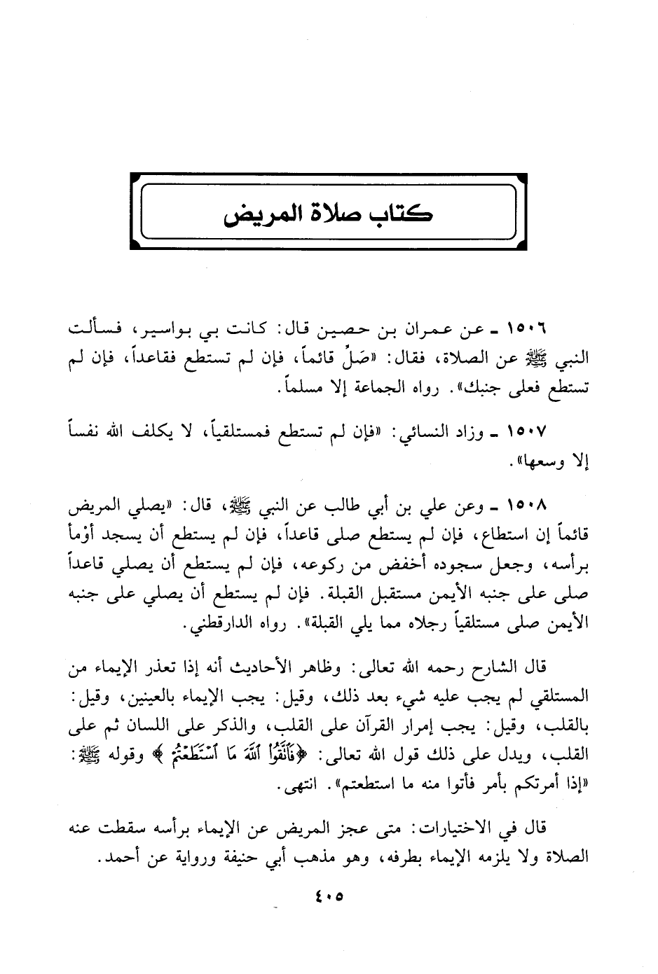1506- عَنْ عِمْرَانَ بْنِ حُصَيْنٍ قَالَ: كَانَتْ بِي بَوَاسِيرُ، فَسَأَلْتُ ... النَّبِيَّ - صلى الله عليه وسلم - عَنْ الصَّلَاةِ فَقَالَ: «صَلِّ قَائِمًا، فَإِنْ لَمْ تَسْتَطِعْ فَقَاعِدًا، فَإِنْ لَمْ تَسْتَطِعْ فَعَلَى جَنْبِكَ» . رَوَاهُ الْجَمَاعَة إلَّا مُسْلِمًا.