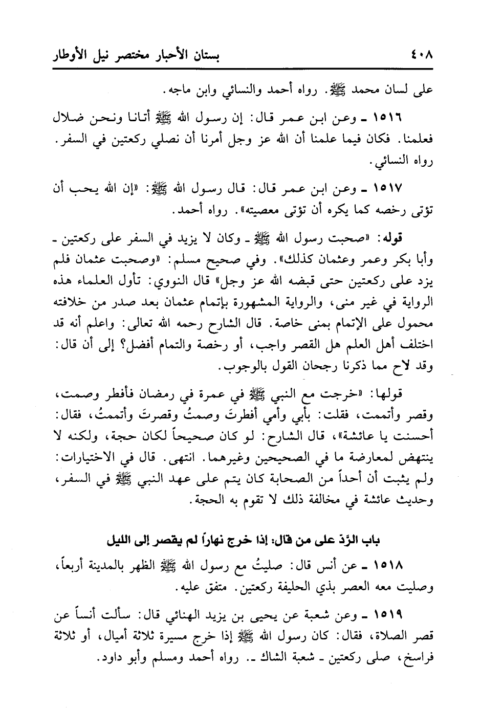 قَوْلُهُ: (صَحِبْتُ رَسُولَ اللهِ - صلى الله عليه وسلم - وَكَانَ لَا يَزِيدُ فِي السَّفَرِ عَلَى رَكْعَتَيْنِ وَأَبَا بَكْرٍ وَعُمَرَ وَعُثْمَانَ كَذَلِكَ) . وَفِي صَحِيحِ مُسْلِمٍ: وَصَحِبْتُ عُثْمَانَ فَلَمْ يَزِدْ عَلَى رَكْعَتَيْنِ حَتَّى قَبَضَهُ اللَّهُ عَزَّ وَجَلَّ. قَالَ النَّوَوِيُّ: تَأَوَّلَ الْعُلَمَاءُ هَذِهِ الرِّوَايَةَ فِي غَيْرِ مِنًى، وَالرِّوَايَةُ الْمَشْهُورَةُ بِإِتْمَامِ عُثْمَانَ بَعَدَ صَدْرٍ مِنْ خِلَافَتِهِ مَحْمُولَةٌ عَلَى الْإِتْمَامِ بِمِنًى خَاصَّة. ... قَالَ الشَّارِحُ رَحِمَهُ اللَّهُ تَعَالَى: وَاعْلَمْ أَنَّهُ قَدْ اخْتَلَفَ أَهْلُ الْعِلْمِ هَلْ الْقَصْرُ وَاجِبٌ أَمْ رُخْصَةٌ وَالتَّمَامُ أَفْضَلُ؟ إِلِى أَنْ قَالَ: وَقَدْ لَاحَ مِنْ مَجْمُوعِ مَا ذَكَرْنَا رُجْحَانُ الْقَوْلِ بِالْوُجُوبِ.