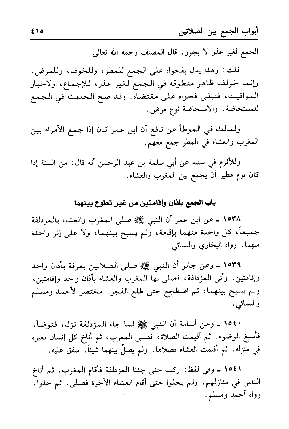 1538- عَنْ ابْنِ عُمَرَ أَنَّ النَّبِيَّ - صلى الله عليه وسلم - صَلَّى الْمَغْرِبَ وَالْعِشَاءَ بِالْمُزْدَلِفَةِ جَمِيعًا كُلُّ وَاحِدَةٍ مِنْهُمَا بِإِقَامَةٍ وَلَمْ يُسَبِّحْ بَيْنَهُمَا، وَلَا عَلَى أَثَرِ وَاحِدَةٍ مِنْهُمَا. رَوَاهُ الْبُخَارِيّ وَالنَّسَائِيُّ.