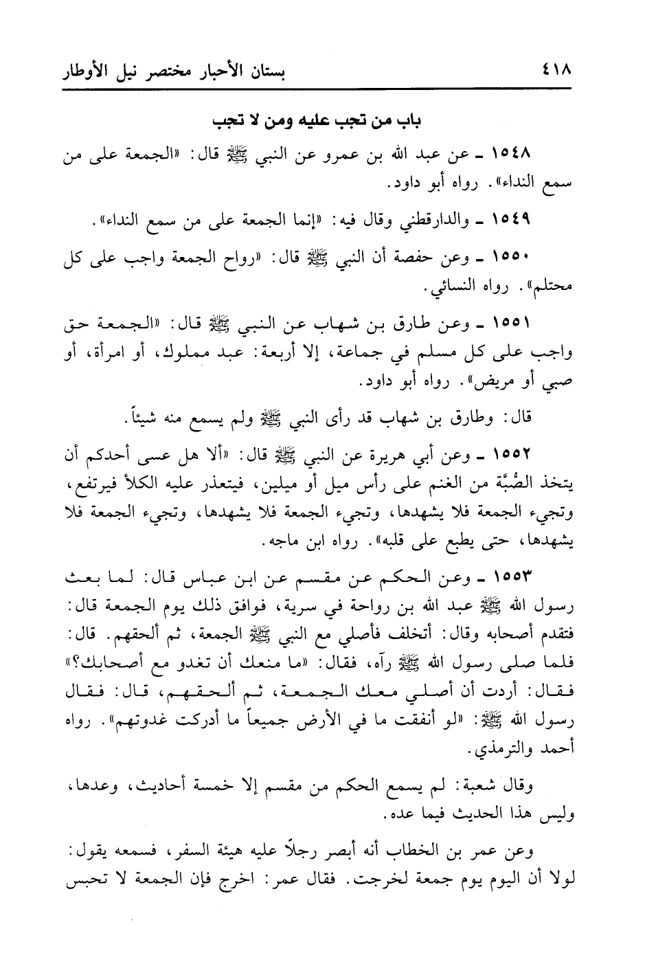 1548- عَنْ عَبْدِ اللَّهِ بْنِ عَمْرٍو عَنْ النَّبِيِّ - صلى الله عليه وسلم - قَالَ: «الْجُمُعَةُ عَلَى مَنْ سَمِعَ النِّدَاءَ» . رَوَاهُ أَبُو دَاوُد.
