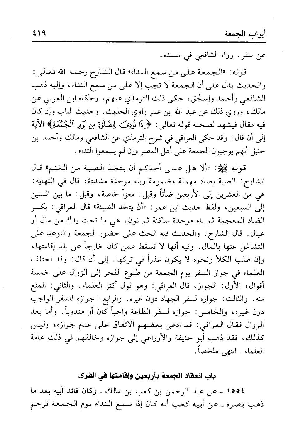 قَوْلُهُ: «أَلَا هَلْ عَسَى أَحَدُكُمْ أَنْ يَتَّخِذَ الصُّبَّةَ مِنْ الْغَنَمِ» . قَالَ الشَّارِحُ: الصُّبَّة بِصَادٍ مُهْمَلَة مَضْمُومَة وَبَعْدهَا بَاءٌ مُوَحَّدَة مُشَدَّدَة. قَالَ فِي النِّهَايَةِ: هُنَّ مِنْ الْعِشْرِينَ إلَى الْأَرْبَعِينَ ضَأْنًا، وَقِيلَ: مَعْزًا خَاصَّة، وَقِيلَ: مَا بَيْن السِّتِّينَ إلَى السَّبْعِينَ، وَلَفْظ حَدِيثِ ابْنِ عُمَرَ «أَنْ يَتَّخِذ الضِّبْنَة» قَالَ الْعِرَاقِيُّ: بِكَسْرِ الضَّاد الْمُعْجَمَة ثُمَّ بَاءٌ مُوَحَّدَة سَاكِنَةٌ ثُمَّ نُون: هِيَ مَا تَحْت يَدك مِنْ مَال أَوْ عِيَال. قَالَ الشَّارِحُ: وَالْحَدِيثُ فِيهِ الْحَث عَلَى حُضُورِ الْجُمُعَةِ وَالتَّوَعُّدُ عَلَى التَّشَاغُلِ عَنْهَا بِالْمَالِ. وَفِيهِ أَنَّهَا لَا تَسْقُط عَمَّنْ كَانَ خَارِجًا عَنْ بَلَد إقَامَتهَا وَإِنَّ طَلَبَ الْكَلَأ وَنَحْوه لَا يَكُون عُذْرَا فِي تَرْكهَا. إِلِى أَنْ قَالَ: وَقَدْ اخْتَلَفَ الْعُلَمَاءُ فِي جَوَاز السَّفَرِ يَوْمَ الْجُمُعَةِ مِنْ طُلُوعِ الْفَجْرِ إلَى الزَّوَالِ عَلَى خَمْسَة أَقْوَال: الْأَوَّل: الْجَوَاز، قَالَ الْعِرَاقِيُّ: وَهُوَ قَوْل أَكْثَر الْعُلَمَاءِ. وَالثَّانِي: الْمَنْع مِنْهُ. وَالثَّالِثُ: جَوَازه لِسَفَرِ الْجِهَاد دُون غَيْره. وَالرَّابِع: جَوَازه لِلسَّفَرِ