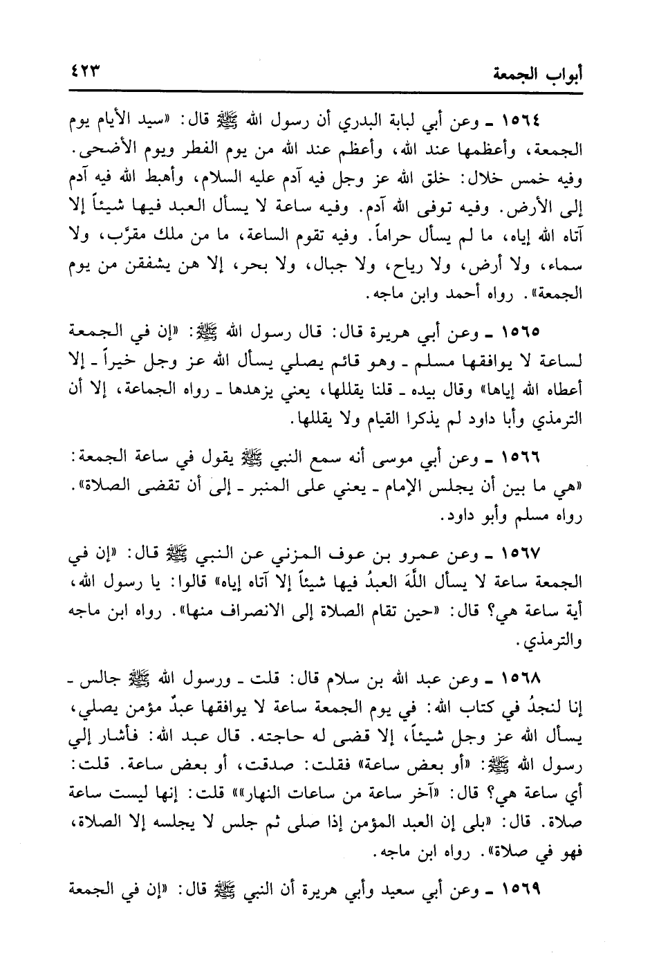 1564- وَعَنْ أَبِي لُبَابَةَ الْبَدْرِيِّ أَنَّ رَسُولَ اللَّهِ - صلى الله عليه وسلم - قَالَ: «سَيِّدُ الْأَيَّامِ يَوْمُ الْجُمُعَةِ وَأَعْظَمُهَا عِنْدَ اللَّهِ، وَأَعْظَمُ عِنْدَ مِنْ يَوْمِ الْفِطْرِ وَيَوْمِ الْأَضْحَى، وَفِيهِ خَمْسُ خِلَالٍ: خَلَقَ اللَّهُ عَزَّ وَجَلَّ فِيهِ آدَمَ عَلَيْهِ السَّلام وَأَهْبَطَ اللَّهُ فِيهِ آدَمَ إلَى