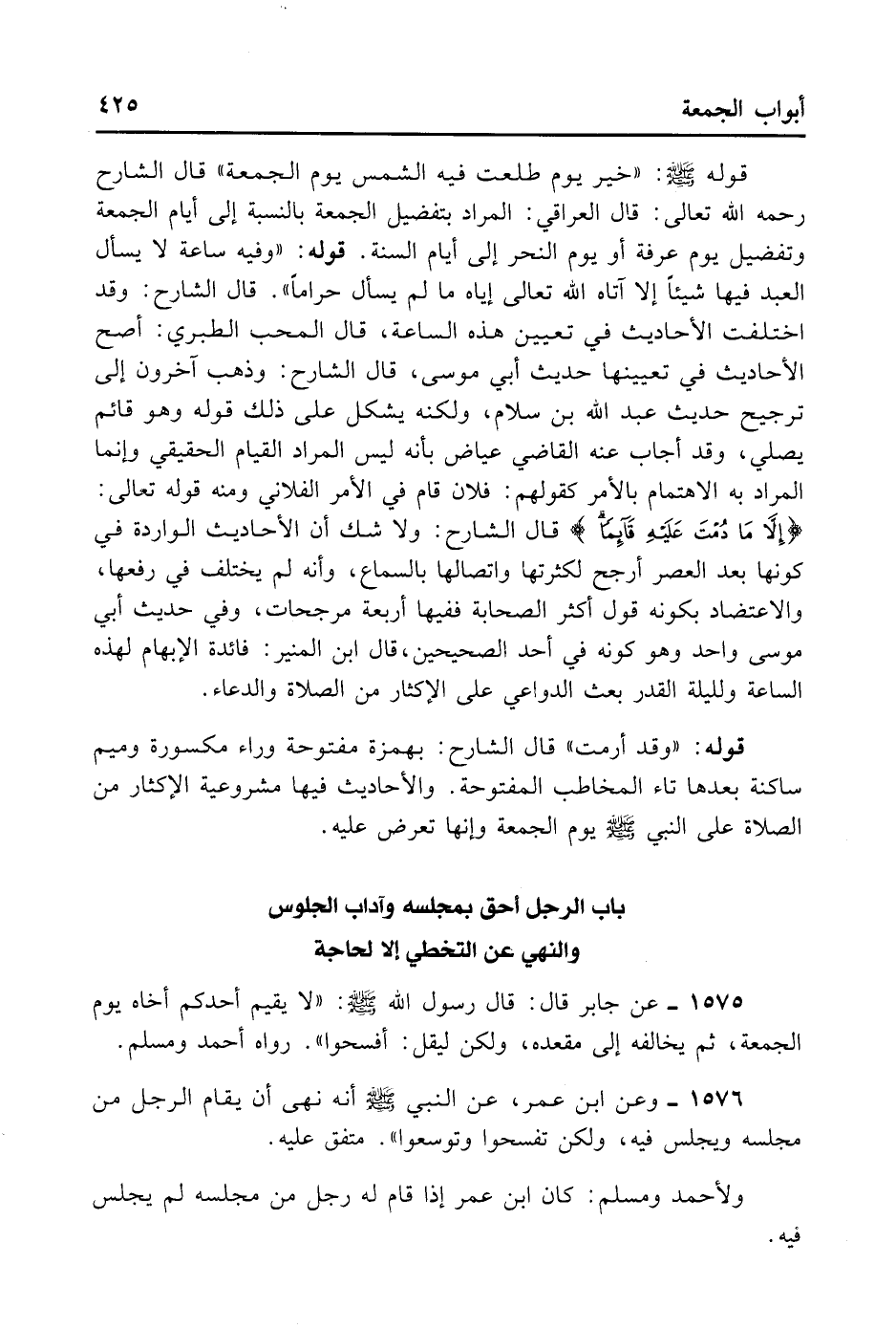 قَوْلُهُ: «خَيْرُ يَوْمٍ طَلَعَتْ فِيهِ الشَّمْسُ يَوْمُ الْجُمُعَةِ» . قَالَ الشَّارِحُ رَحِمَهُ اللَّهُ تَعَالَى: قَالَ الْعِرَاقِيُّ: الْمُرَاد بِتَفْضِيلِ الْجُمُعَة بِالنِّسْبَةِ إلَى أَيَّام الْجُمُعَة، وَتَفْضِيل يَوْم عَرَفَةَ أَوْ يَوْم النَّحْر بِالنِّسْبَةِ إلَى أَيَّام السَّنَة.