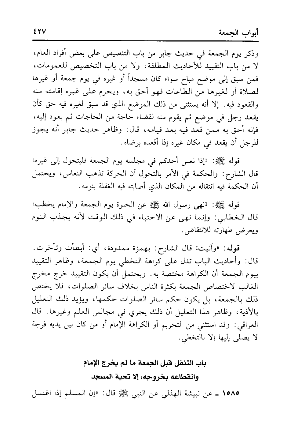 وَذَكَر يَوْم الْجُمُعَة فِي حَدِيثِ جَابِرٍ مِنْ بَاب التَّنْصِيص عَلَى بَعْض أَفْرَاد الْعَامّ لَا مِنْ بَابِ التَّقْيِيد لِلْأَحَادِيثِ الْمُطْلَقَة، وَلَا مِنْ بَابِ التَّخْصِيص لِلْعُمُومَاتِ، فَمَنْ سَبَقَ إلَى مَوْضِع مُبَاح سَوَاءٌ كَانَ مَسْجِدًا أَوْ غَيْره فِي يَوْم
