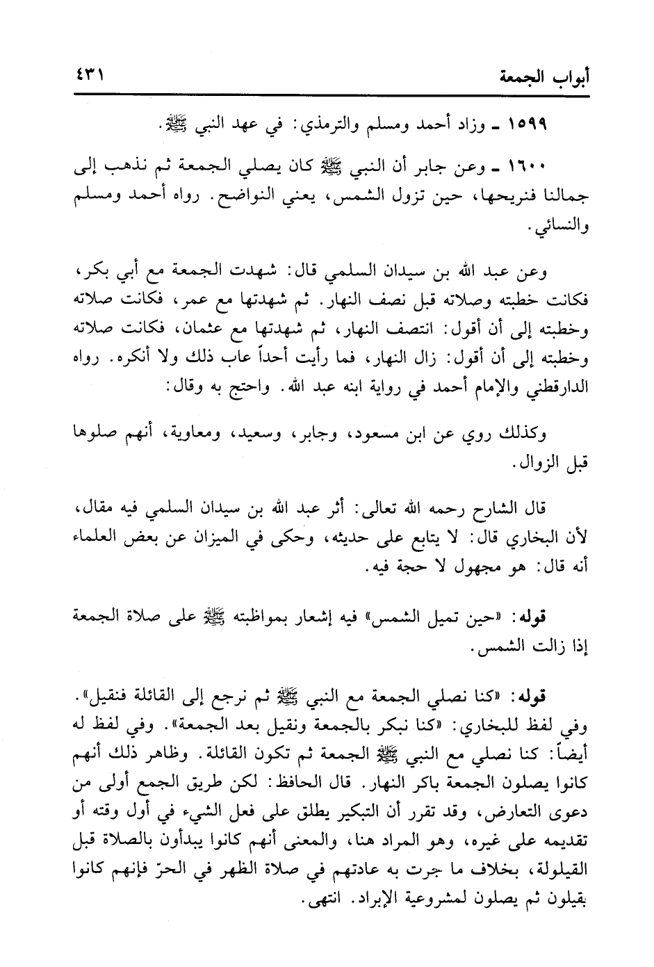 1600- وَعَنْ جَابِرٍ: أَنَّ النَّبِيَّ - صلى الله عليه وسلم - كَانَ يُصَلِّي الْجُمُعَةَ ثُمَّ نَذْهَبُ إلَى جِمَالِنَا فَنُرِيحُهَا حِينَ تَزُولُ الشَّمْسُ، يَعْنِي النَّوَاضِحَ. رَوَاهُ أَحْمَدُ وَمُسْلِمٌ وَالنَّسَائِيُّ.