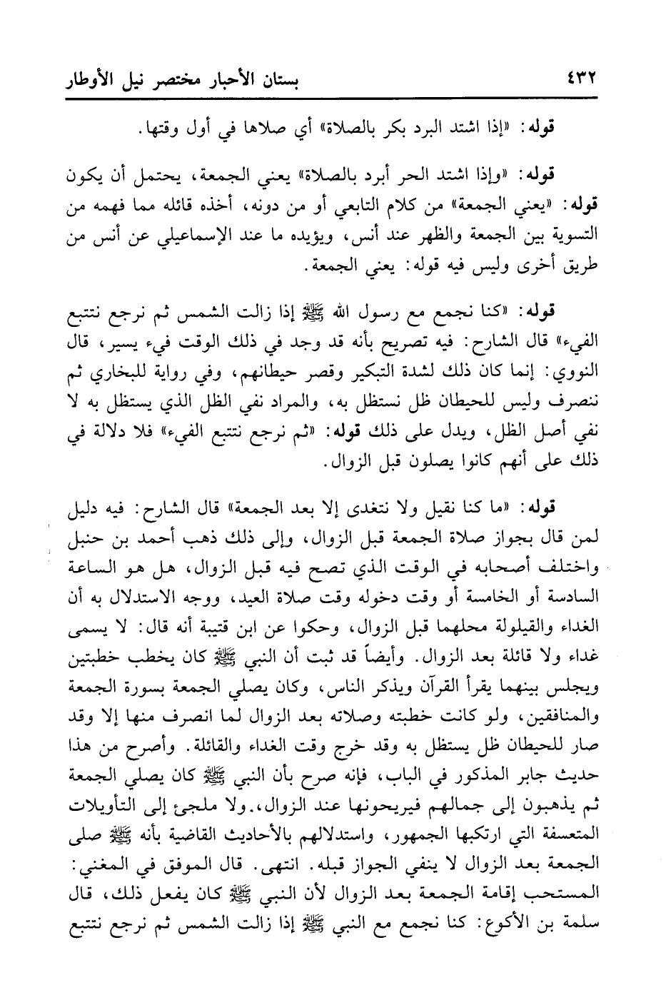 قَوْلُهُ: (كُنَّا نُجَمِّعُ مَعَ رَسُولِ اللَّهِ - صلى الله عليه وسلم - إذَا زَالَتْ الشَّمْسُ ثُمَّ نَرْجِعُ نَتَتَبَّعُ الْفَيْءَ) . قَالَ الشَّارِحُ: فِيهِ تَصْرِيحٌ بِأَنَّهُ قَدْ وُجِدَ فِي ذَلِكَ الْوَقْتِ فَيْءٌ يَسِيرٌ. قَالَ النَّوَوِيُّ: إنَّمَا كَانَ ذَلِكَ لِشِدَّةِ التَّبْكِيرِ وَقَصْرِ حِيطَانِهِمْ. وَفِي رِوَايَةٍ لِلْبُخَارِيِّ: ثُمَّ نَنْصَرِفُ وَلَيْسَ لِلْحِيطَانِ ظِلٌّ نَسْتَظِلُّ بِهِ. وَالْمُرَادُ نَفْيَ الظِّلِّ الَّذِي يُسْتَظَلُّ بِهِ، لَا نَفْيَ أَصْلِ الظِّلِّ، وَيَدُلُّ عَلَى ذَلِكَ قَوْلُهُ: (ثُمَّ نَرْجِعُ نَتَتَبَّعُ الْفَيْءَ) . فَلَا دَلَالَةَ فِي ذَلِكَ عَلَى أَنَّهُمْ كَانُوا يُصَلُّونَ قَبْلَ الزَّوَالِ.
