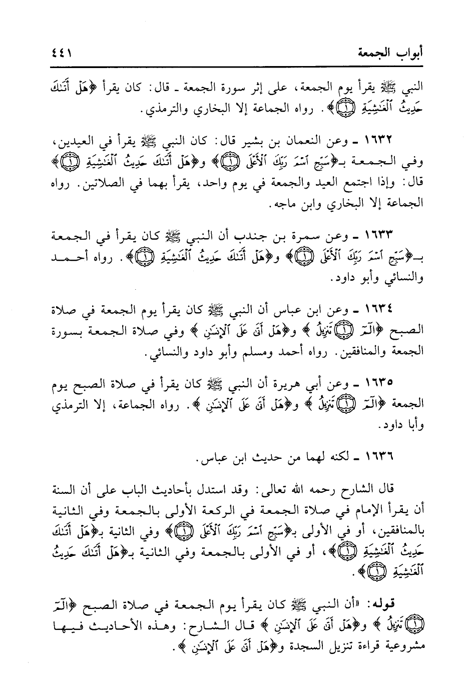 1635- وَعَنْ أَبِي هُرَيْرَةَ: أَنَّ النَّبِيَّ - صلى الله عليه وسلم - كَانَ يَقْرَأُ فِي صَلَاةِ الصُّبْحِ يَوْمَ الْجُمُعَةِ {آلم تَنْزِيلُ} ، {وَهَلْ أَتَى عَلَى الْإِنْسَانِ} . رَوَاهُ الْجَمَاعَةُ إلَّا التِّرْمِذِيَّ وَأَبَا دَاوُد.