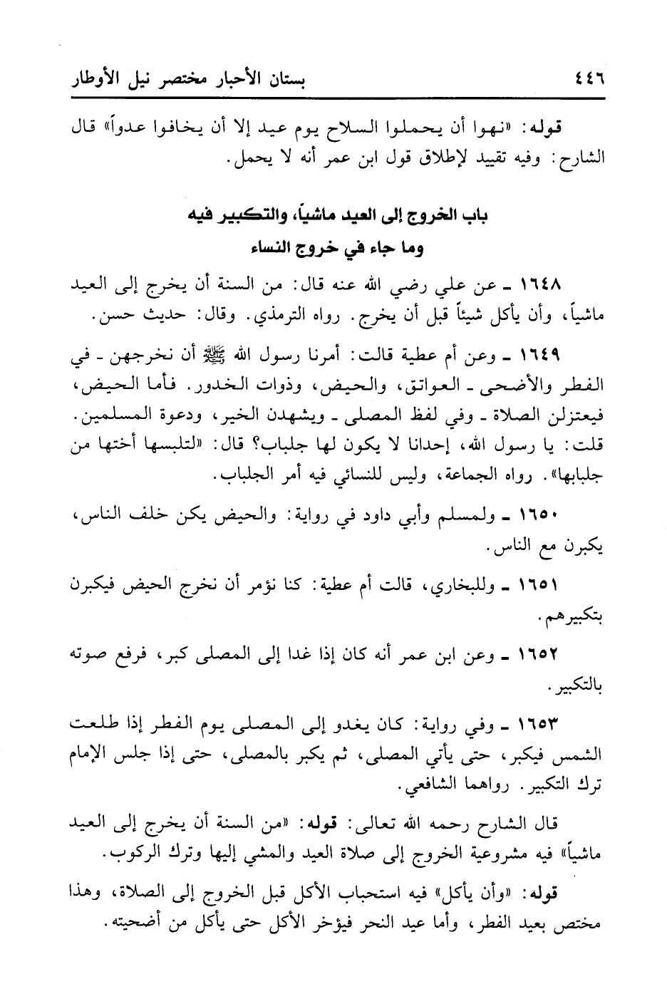 1652- وَعَنْ ابْنِ عُمَرَ أَنَّهُ كَانَ إذَا غَدَا إلَى الْمُصَلَّى كَبَّرَ فَرَفَعَ صَوْتَهُ بِالتَّكْبِيرِ.