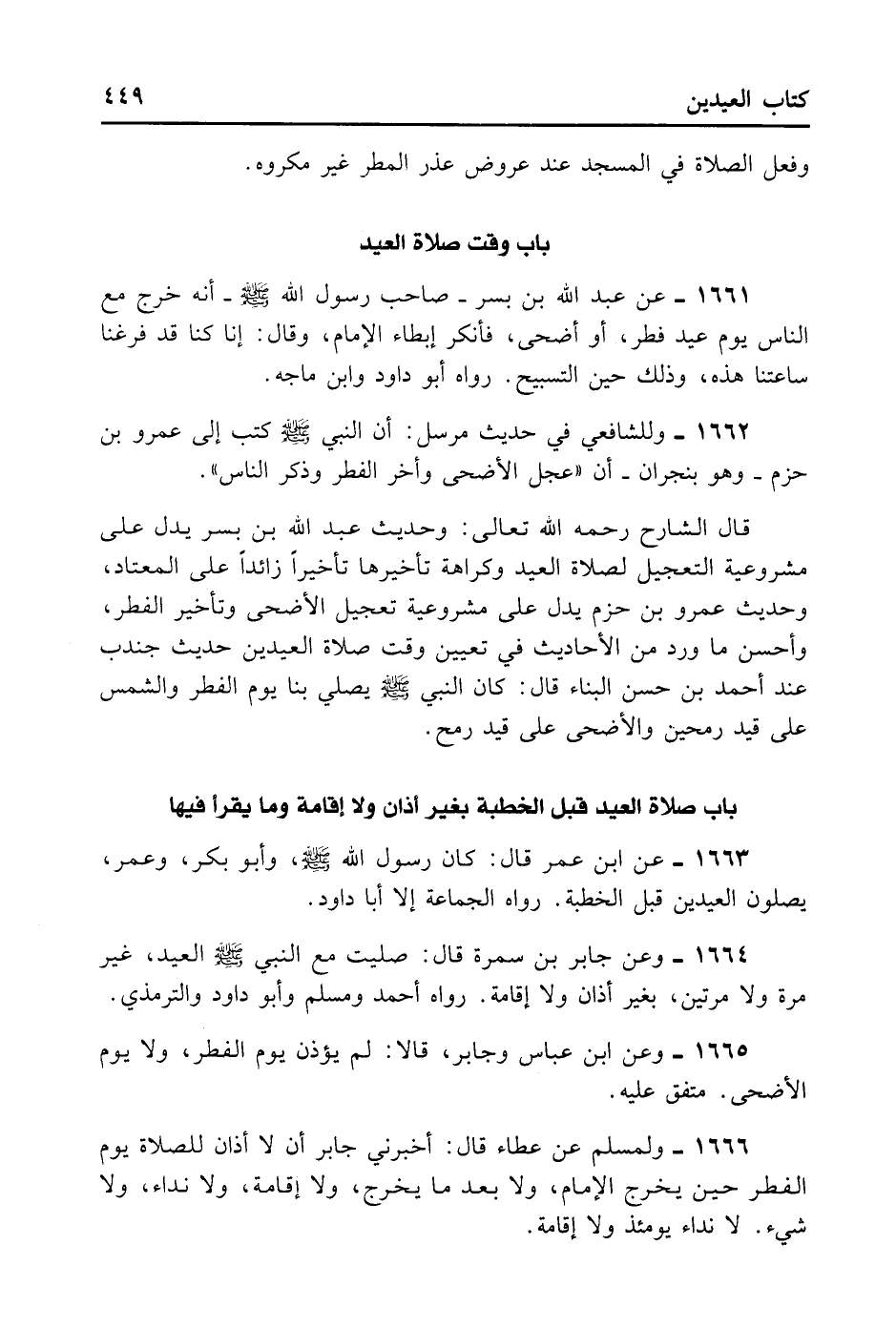 قَالَ الشَّارِحُ رَحِمَهُ اللَّهُ تَعَالَى: وَحَدِيثُ عَبْدِ اللَّهِ بْنِ بُسْرٍ يَدُلُّ عَلَى مَشْرُوعِيَّة التَّعْجِيلِ لِصَلَاةِ الْعِيدِ وَكَرَاهَةِ تَأْخِيرِهَا تَأْخِيرًا زَائِدًا عَلَى الْمِيعَادِ. وَحَدِيثُ عَمْرِو بْنِ حَزْمٍ يَدُلُّ عَلَى مَشْرُوعِيَّة تَعْجِيلِ الْأَضْحَى وَتَأْخِيرِ الْفِطْرِ.