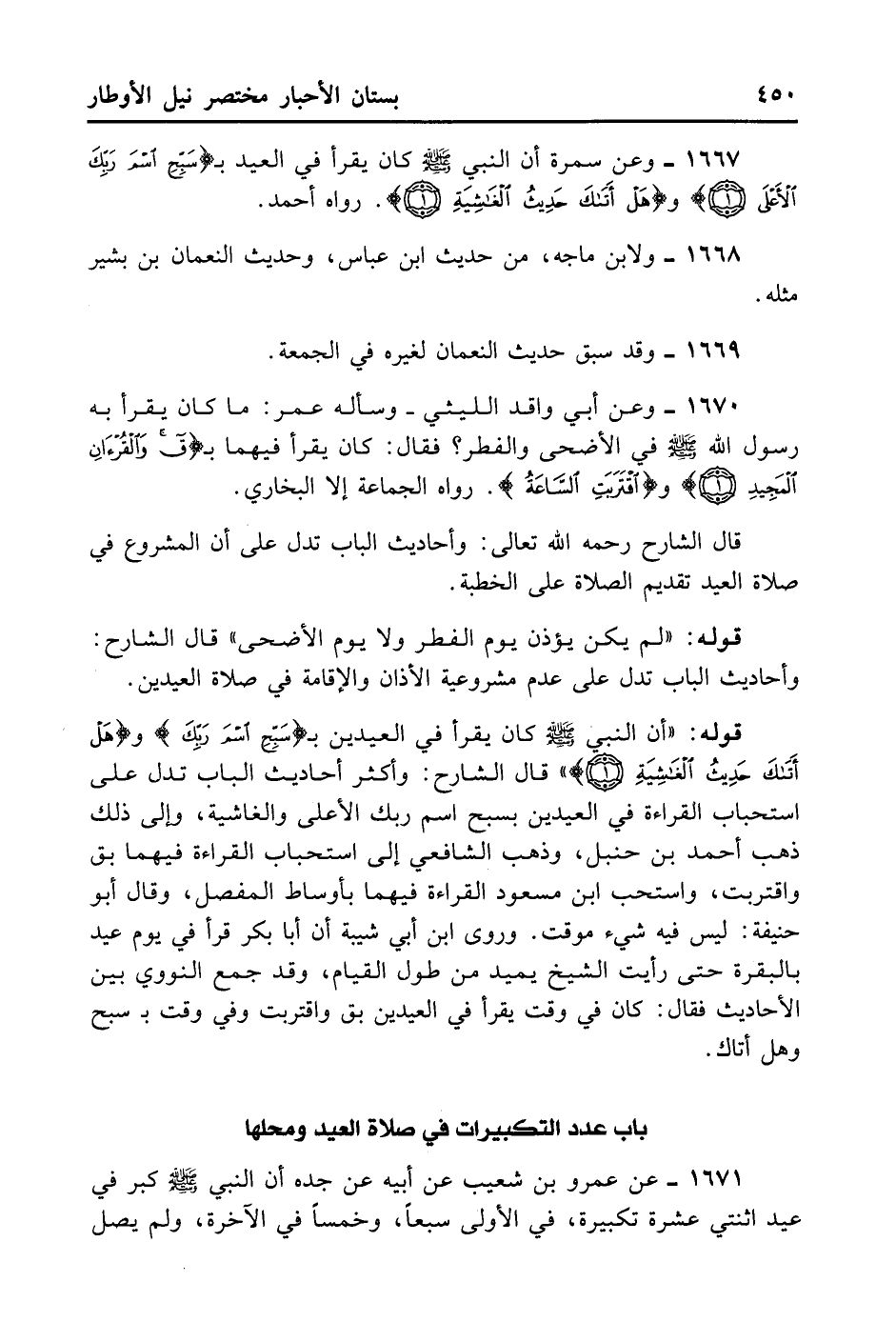 1667- وَعَنْ سَمُرَةَ أَنَّ النَّبِيَّ - صلى الله عليه وسلم - كَانَ يَقْرَأُ فِي الْعِيدَيْنِ: بِـ {سَبِّحْ اسْمَ رَبِّكَ الْأَعْلَى} ، وَ {هَلْ أَتَاكَ حَدِيثُ الْغَاشِيَةِ} . رَوَاهُ أَحْمَدُ.