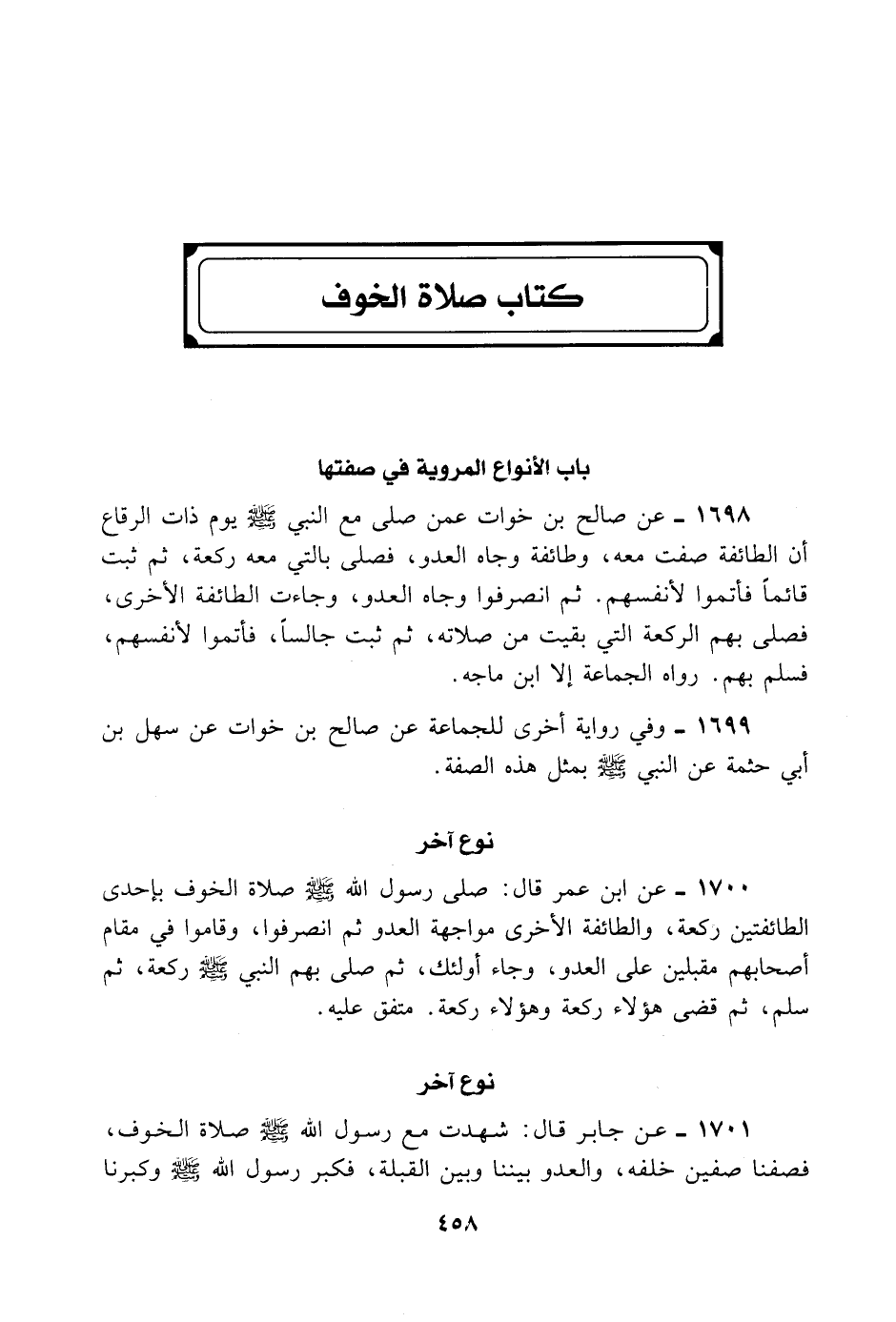 1700- عَنْ ابْنِ عُمَرَ قَالَ: صَلَّى رَسُولُ اللَّهِ - صلى الله عليه وسلم - صَلَاةَ الْخَوْفِ بِإِحْدَى الطَّائِفَتَيْنِ رَكْعَةً، وَالطَّائِفَةُ الْأُخْرَى مُوَاجِهَةٌ الْعَدُوِّ، ثُمَّ انْصَرَفُوا وَقَامُوا فِي مَقَامِ أَصْحَابِهِمْ مُقْبِلِينَ عَلَى الْعَدُوِّ وَجَاءَ أُولَئِكَ، ثُمَّ صَلَّى بِهِمْ النَّبِيُّ - صلى الله عليه وسلم - رَكْعَةً ثُمَّ سَلَّمَ ثُمَّ قَضَى هَؤُلَاءِ رَكْعَةً، وَهَؤُلَاءِ رَكْعَةً. مُتَّفَقٌ عَلَيْهِ.
