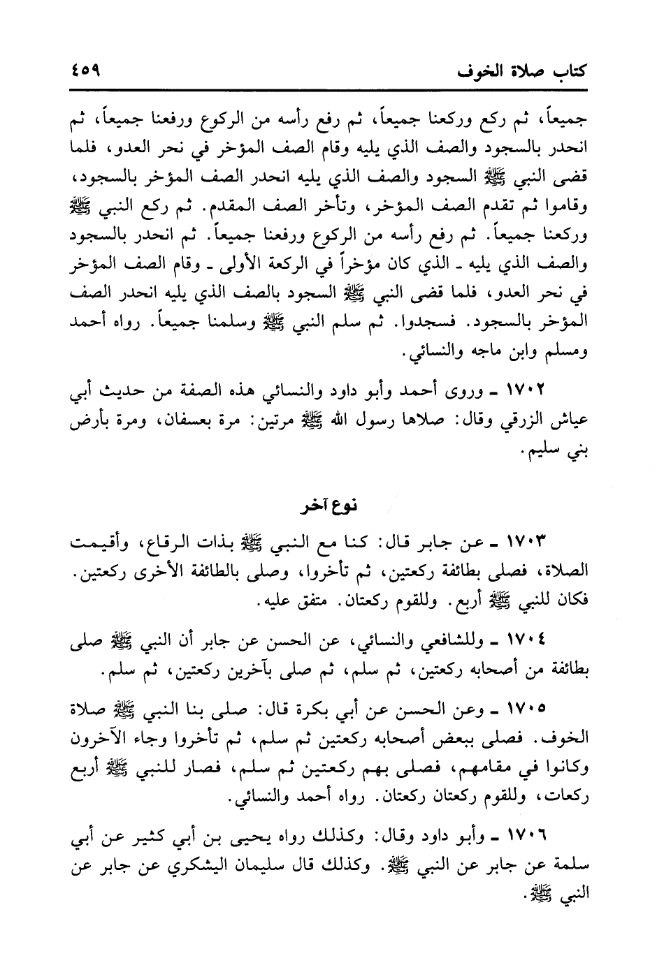 1705- وَعَنْ الْحَسَنِ عَنْ أَبِي بَكْرَةَ قَالَ: صَلَّى بِنَا النَّبِيُّ - صلى الله عليه وسلم - صَلَاةَ الْخَوْفِ، فَصَلَّى بِبَعْضِ أَصْحَابِهِ رَكْعَتَيْنِ ثُمَّ سَلَّمَ، ثُمَّ تَأَخَّرُوا وَجَاءَ الْآخَرُونَ وَكَانُوا فِي مَقَامِهِمْ، فَصَلَّى بِهِمْ رَكْعَتَيْنِ ثُمَّ سَلَّمَ، فَصَارَ لِلنَّبِيِّ - صلى الله عليه وسلم - أَرْبَعَ رَكَعَاتٍ، وَلِلْقَوْمِ رَكْعَتَانِ رَكْعَتَانِ. رَوَاهُ أَحْمَدُ وَالنَّسَائِيُّ.