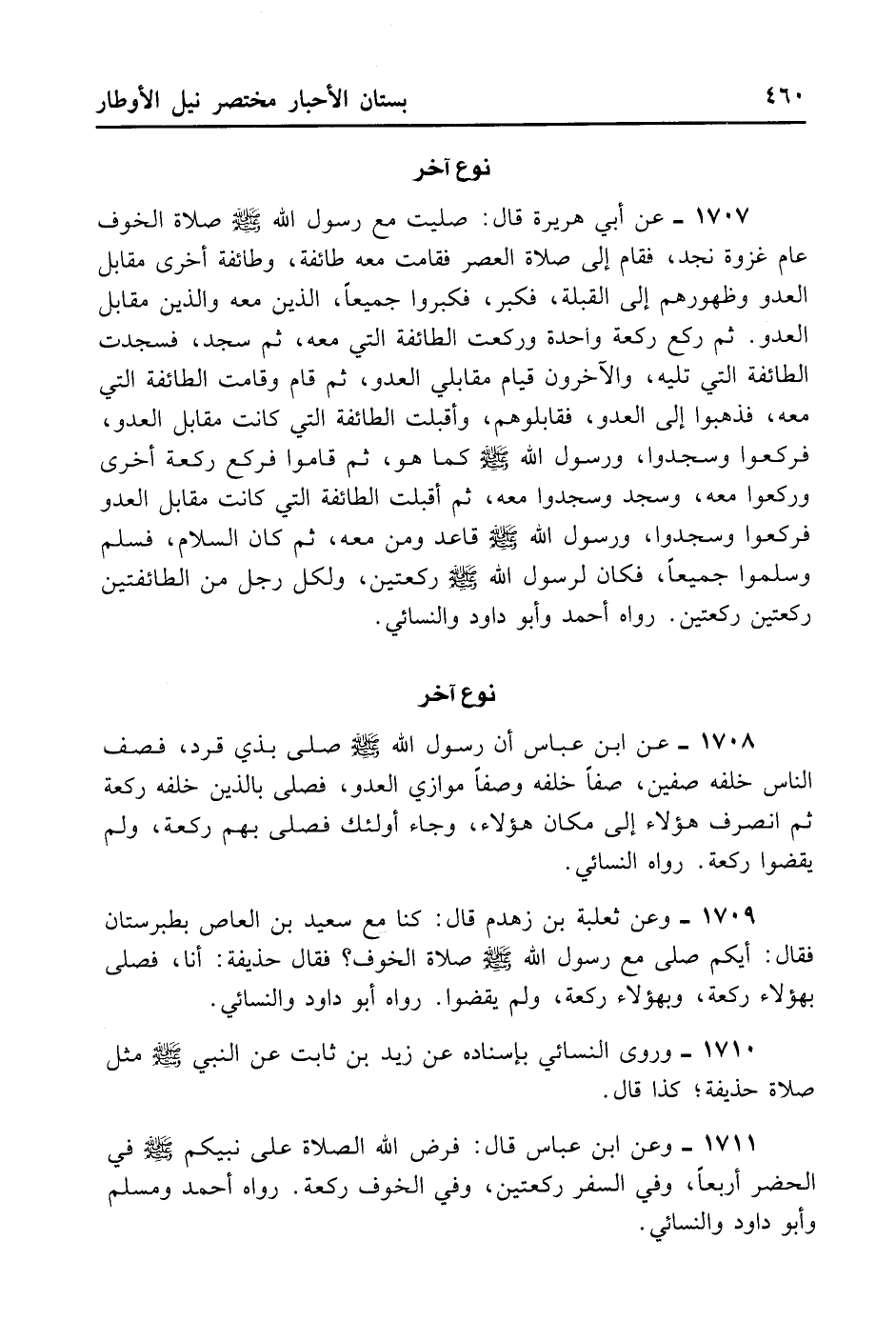 1707- عَنْ أَبِي هُرَيْرَةَ قَالَ: صَلَّيْتُ مَعَ رَسُولِ اللَّهِ - صلى الله عليه وسلم - صَلَاةَ الْخَوْفِ عَامَ غَزْوَةِ نَجْدٍ، فَقَامَ إلَى صَلَاةِ الْعَصْرِ فَقَامَتْ مَعَهُ طَائِفَةٌ، وَطَائِفَةٌ أُخْرَى مُقَابِلَ الْعَدُوِّ وَظُهُورُهُمْ إلَى الْقِبْلَةِ، فَكَبَّرَ فَكَبَّرُوا جَمِيعًا الَّذِينَ مَعَهُ وَاَلَّذِينَ مُقَابِلَ الْعَدُوِّ ثُمَّ رَكَعَ رَكْعَةً وَاحِدَةً وَرَكَعَتْ الطَّائِفَةُ الَّتِي مَعَهُ، ثُمَّ سَجَدَ فَسَجَدَتْ الطَّائِفَةُ الَّتِي تَلِيهِ وَالْآخَرُونَ قِيَامٌ مُقَابِلِي الْعَدُوِّ، ثُمَّ قَامَ وَقَامَتْ الطَّائِفَةُ الَّتِي مَعَهُ، فَذَهَبُوا إلَى الْعَدُوِّ فَقَابَلُوهُمْ وَأَقْبَلَتْ الطَّائِفَةُ الَّتِي كَانَتْ مُقَابِلَ الْعَدُوِّ، فَرَكَعُوا وَسَجَدُوا وَرَسُولُ اللَّهِ - صلى الله عليه وسلم - كَمَا هُوَ، ثُمَّ قَامُوا فَرَكَعَ رَكْعَةً أُخْرَى وَرَكَعُوا مَعَهُ وَسَجَدَ وَسَجَدُوا مَعَهُ، ثُمَّ أَقْبَلَتْ الطَّائِفَةُ الَّتِي كَانَتْ مُقَابِلَ الْعَدُوِّ فَرَكَعُوا وَسَجَدُوا وَرَسُولُ اللَّهِ - صلى الله عليه وسلم - قَاعِدٌ وَمَنْ مَعَهُ، ثُمَّ كَانَ السَّلَامُ فَسَلَّمَ وَسَلَّمُوا جَمِيعًا، فَكَانَ لِرَسُولِ اللَّهِ - صلى الله عليه وسلم - رَكْعَتَينِ، وَلِكُلِّ رَجَلٌ مِن الطَّائِفَتَيْن رَكْعَتَيْنِ رَكْعَتَيْنِ. رَوَاهُ أَحْمَدُ وَأَبُو دَاوُد وَالنَّسَائِيُّ.
