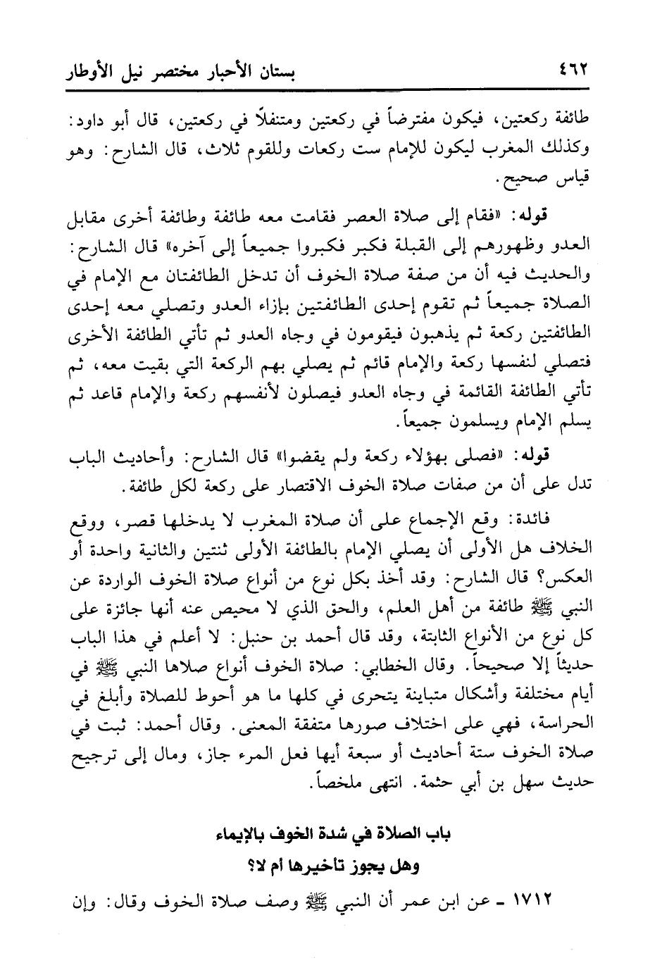 1712- عَنْ ابْنِ عُمَرَ أَنَّ النَّبِيَّ - صلى الله عليه وسلم - وَصَفَ صَلَاةَ الْخَوْفِ وَقَالَ: وَإِنْ
