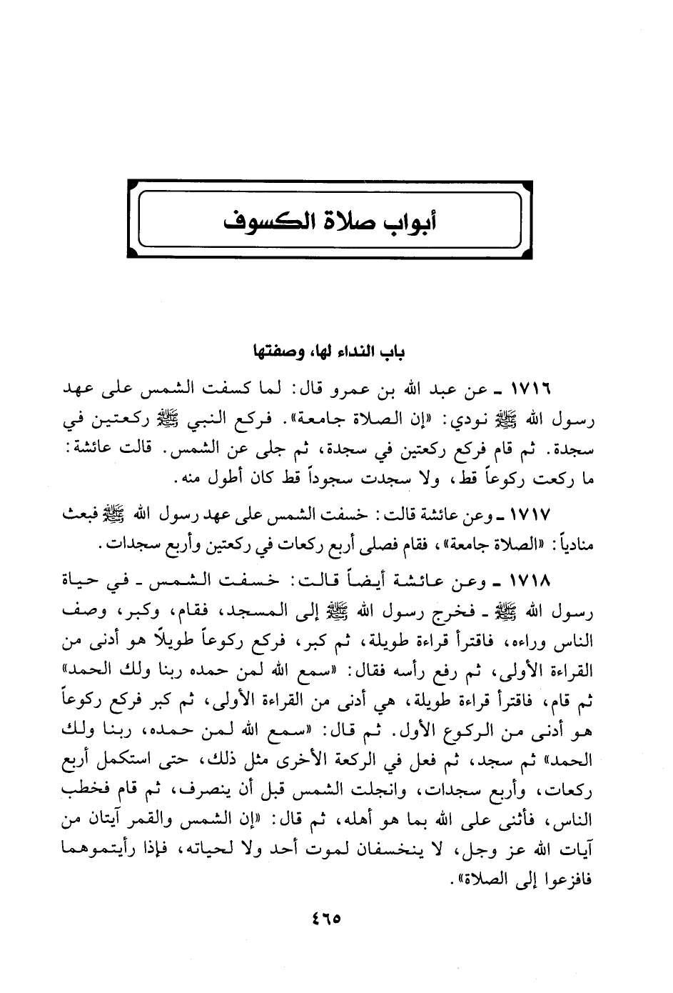 1716- عَنْ عَبْدِ اللَّهِ بْنِ عَمْرٍو قَالَ: لَمَّا كَسَفَتْ الشَّمْسُ عَلَى عَهْدِ رَسُول اللهِ - صلى الله عليه وسلم - نُودِيَ أَنَّ الصَّلَاةَ جَامِعَةٌ، فَرَكَعَ النَّبِيُّ - صلى الله عليه وسلم - رَكْعَتَيْنِ فِي سَجْدَةٍ، ثُمَّ قَامَ فَرَكَعَ رَكْعَتَيْنِ فِي سَجْدَةٍ، ثُمَّ جُلِّيَ عَنْ الشَّمْسِ قَالَتْ عَائِشَةُ: مَا رَكَعْتُ رُكُوعًا قَطُّ وَلَا سَجَدْتُ سُجُودًا قَطُّ، كَانَ أَطْوَلَ مِنْهُ.