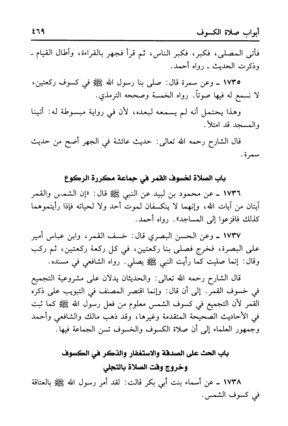 1735- وَعَنْ سَمُرَةَ قَالَ: صَلَّى بِنَا رَسُولُ اللَّهِ - صلى الله عليه وسلم - فِي كُسُوفٍ رَكْعَتَيْنِ لَا نَسْمَعُ لَهُ فِيهَا صَوْتًا. رَوَاهُ الْخَمْسَةُ وَصَحَّحَهُ التِّرْمِذِيُّ.