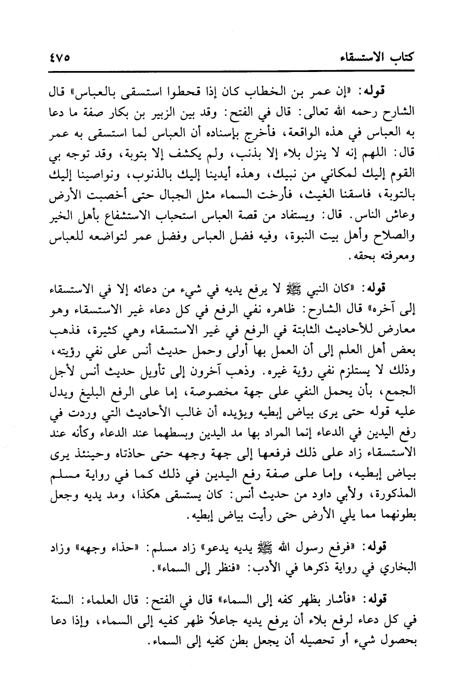بَعْضُ أَهْلِ الْعِلْمِ إلَى أَنَّ الْعَمَلَ بِهَا أَوْلَى، وَحُمِلَ حَدِيثُ أَنَسٍ عَلَى نَفْيِ رُؤْيَتِهِ وَذَلِكَ لَا يَسْتَلْزِمُ نَفْيَ رُؤْيَةِ غَيْرِهِ، وَذَهَبَ آخَرُونَ إلَى تَأْوِيلِ حَدِيثِ أَنَسٍ لِأَجْلِ الْجَمْعِ بِأَنْ يُحْمَلَ النَّفْيُ عَلَى جِهَةٍ مَخْصُوصَةٍ: إمَّا عَلَى الرَّفْعِ الْبَلِيغِ، وَيَدُلُّ عَلَيْهِ قَوْلُهُ: «حَتَّى يُرَى بَيَاضُ إبْطَيْهِ وَيُؤَيِّدُهُ أَنَّ غَالِبَ الْأَحَادِيثِ الَّتِي وَرَدَتْ فِي رَفْعِ الْيَدَيْنِ فِي الدُّعَاءِ. إنَّمَا الْمُرَادُ بِهَا مَدُّ الْيَدَيْنِ وَبَسْطُهُمَا عِنْدَ الدُّعَاءِ، وَكَأَنَّهُ عِنْدَ الِاسْتِسْقَاءِ زَادَ عَلَى ذَلِكَ فَرَفَعَهُمَا إلَى جِهَةِ وَجْهِهِ حَتَّى حَاذَتَاهُ وَحِينَئِذٍ يُرَى بَيَاضُ إبْطَيْهِ، وَإِمَّا عَلَى صِفَةِ رَفْعِ الْيَدَيْنِ فِي ذَلِكَ كَمَا فِي رِوَايَةِ مُسْلِمٍ الْمَذْكُورَةِ فِي الْبَابِ وَلِأَبِي دَاوُد مِنْ حَدِيثِ أَنَسٍ: «كَانَ يَسْتَسْقِي هَكَذَا وَمَدَّ يَدَيْهِ وَجَعَلَ بُطُونَهُمَا مِمَّا يَلِي الْأَرْضَ حَتَّى رَأَيْتُ بَيَاضَ إبْطَيْهِ» .