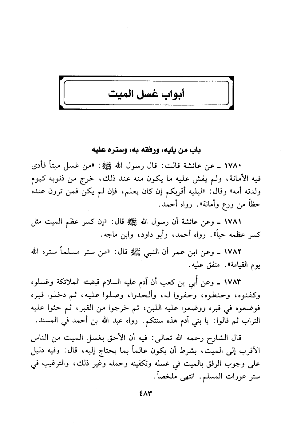 1780- عَنْ عَائِشَةَ قَالَتْ: قَالَ رَسُولُ اللَّهِ - صلى الله عليه وسلم -: «مَنْ غَسَّلَ مَيِّتًا فَأَدَّى فِيهِ الْأَمَانَةَ وَلَمْ يُفْشِ عَلَيْهِ مَا يَكُونُ مِنْهُ عِنْدَ ذَلِكَ، خَرَجَ مِنْ ذُنُوبِهِ كَيَوْمِ وَلَدَتْهُ أُمُّهُ، وَقَالَ: لِيَلِهِ أَقْرَبُكُمْ إنْ كَانَ يَعْلَمُ، فَإِنْ لَمْ يَكُنْ يَعْلَمُ، فَمَنْ تَرَوْنَ عِنْدَهُ حَظًّا مِنْ وَرَعٍ وَأَمَانَةٍ» . رَوَاهُ أَحْمَدُ.