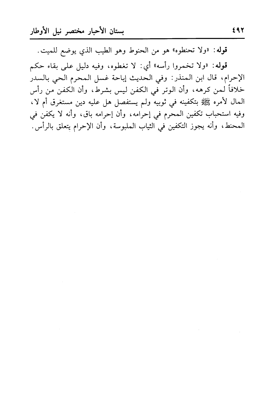قَوْلُهُ: (وَلَا تُخَمِّرُوا رَأْسَهُ) أَيْ لَا تُغَطُّوهُ. وَفِيهِ دَلِيلٌ عَلَى بَقَاءِ حُكْمِ الْإِحْرَامِ. قَالَ ابْنُ الْمُنْذِرِ: وَفِي الْحَدِيثِ إبَاحَةُ غُسْلِ الْمُحْرِمِ الْحَيِّ بِالسِّدْرِ خِلَافًا لَمَنْ كَرِهَهُ، وَأَنَّ الْوِتْرَ فِي الْكَفَنِ لَيْسَ بِشَرْطٍ، وَأَنَّ الْكَفَنَ مِنْ رَأْسِ الْمَالِ لِأَمْرِهِ - صلى الله عليه وسلم - بِتَكْفِينِهِ فِي ثَوْبَيْهِ، وَلَمْ يَسْتَفْصِلْ هَلْ عَلَيْهِ دَيْنٌ مُسْتَغْرِقٌ أَمْ لَا؟ وَفِيهِ اسْتِحْبَابُ تَكْفِينِ الْمُحْرِمِ فِي إحْرَامِهِ، وَأَنَّ إحْرَامَهُ بَاقٍ، وَأَنَّهُ لَا يُكَفَّنُ فِي الْمُحَنَّطِ، وَأَنَّهُ يَجُوزُ التَّكْفِينُ فِي الثِّيَابِ الْمَلْبُوسَةِ، وَأَنَّ الْإِحْرَامَ يَتَعَلَّقُ بِالرَّأْسِ.