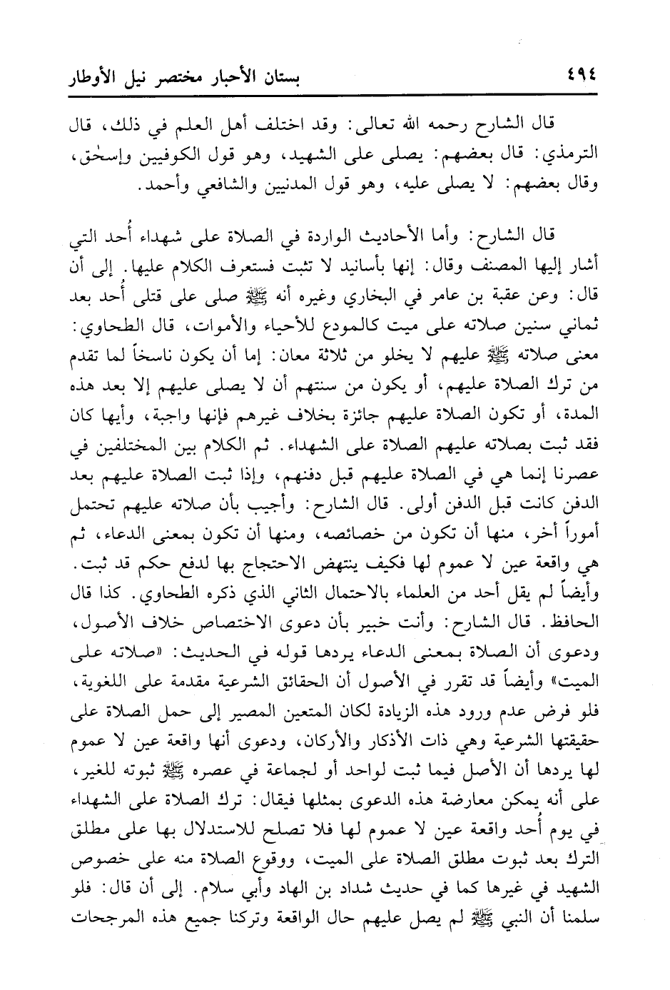 قَالَ الشَّارِحُ: وَأَمَّا الْأَحَادِيثُ الْوَارِدَةُ فِي الصَّلَاةِ عَلَى شُهَدَاءِ أُحُدٍ الَّتِي أَشَارَ إلَيْهَا الْمُصَنِّفُ وَقَالَ: إنَّهَا بِأَسَانِيدَ لَا تَثْبُت فَسَتَعْرِفُ الْكَلَامَ عَلَيْهَا. إِلِى أَنْ قَالَ: وَعَنْ عُقْبَةَ بْنِ عَامِرٍ فِي الْبُخَارِيِّ وَغَيْرِهِ أَنَّهُ - صلى الله عليه وسلم - صَلَّى عَلَى قَتْلَى أُحُدٍ بَعْدَ