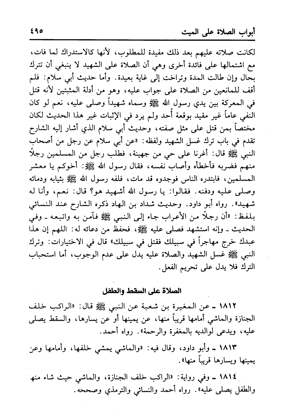 1814- وَفِي رِوَايَةٍ «الرَّاكِبُ خَلْفَ الْجِنَازَةِ وَالْمَاشِي حَيْثُ شَاءَ مِنْهَا وَالطِّفْلُ يُصَلَّى عَلَيْهِ» . رَوَاهُ أَحْمَدُ وَالنَّسَائِيُّ وَالتِّرْمِذِيُّ وَصَحَّحَهُ.