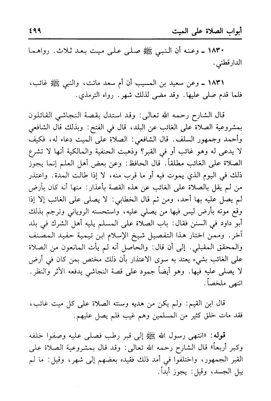وَجُمْهُورُ السَّلَفِ. قَالَ الشَّافِعِيُّ: الصَّلَاةُ عَلَى الْمَيِّتِ دُعَاءٌ لَهُ فَكَيْفَ لَا يُدْعَى لَهُ وَهُوَ غَائِبٌ أَوْ فِي الْقَبْرِ. وَذَهَبَتْ الْحَنَفِيَّةُ وَالْمَالِكِيَّةُ أَنَّهَا لَا تُشْرَعُ الصَّلَاةُ عَلَى الْغَائِبِ مُطْلَقًا. قَالَ الْحَافِظُ: وَعَنْ بَعْضِ أَهْلِ الْعِلْمِ: إنَّمَا يَجُوزُ ذَلِكَ فِي الْيَوْمِ الَّذِي يَمُوتُ فِيهِ أَوْ مَا قَرُبَ مِنْهُ لَا إذَا طَالَتْ الْمُدَّةَ. وَاعْتَذَرَ مَنْ لَمْ يَقُلْ بِالصَّلَاةِ عَلَى الْغَائِبِ عَنْ هَذِهِ الْقِصَّةِ بِأَعْذَارٍ مِنْهَا: أَنَّهُ كَانَ بِأَرْضٍ لَمْ يُصَلِّ عَلَيْهِ بِهَا أَحَدٌ وَمِنْ ثَمَّ قَالَ الْخَطَّابِيُّ: لَا يُصَلَّى عَلَى الْغَائِبِ إلَّا إذَا وَقَعَ مَوْتُهُ بِأَرْضٍ لَيْسَ فِيهَا مَنْ يُصَلِّي عَلَيْهِ، وَاسْتَحْسَنَهُ الرُّويَانِيُّ، وَتَرْجَمَ بِذَلِكَ أَبُو دَاوُد فِي السُّنَنِ فَقَالَ: بَابُ الصَّلَاةِ عَلَى الْمُسْلِمِ يَلِيهِ أَهْلُ الشِّرْكِ فِي بَلَدٍ آخَرَ. وَمِمَّنْ اخْتَارَ هَذَا التَّفْصِيلَ شَيْخُ الْإِسْلَامِ ابْنُ تَيْمِيَّةَ حَفِيدُ الْمُصَنِّفِ وَالْمُحَقِّقُ الْمُقْبِلِيُّ، إِلِى أَنْ قَالَ: وَالْحَاصِلُ أَنَّهُ لَمْ يَأْتِ الْمَانِعُونَ مِنْ الصَّلَاةِ عَلَى الْغَائِبِ بِشَيْءٍ يُعْتَدَّ بِهِ سِوَى الِاعْتِذَارِ بِأَنَّ ذَلِكَ مُخْتَصٌّ بِمَنْ كَانَ فِي أَرْضٍ لَا يُصَلَّى عَلَيْهِ فِيهَا، وَهُوَ أَيْضًا جُمُودٌ عَلَى قِصَّةِ النَّجَاشِيِّ يَدْفَعُهُ الْأَثَرُ وَالنَّظَرُ. انْتَهَى مُلَخَّصًا.