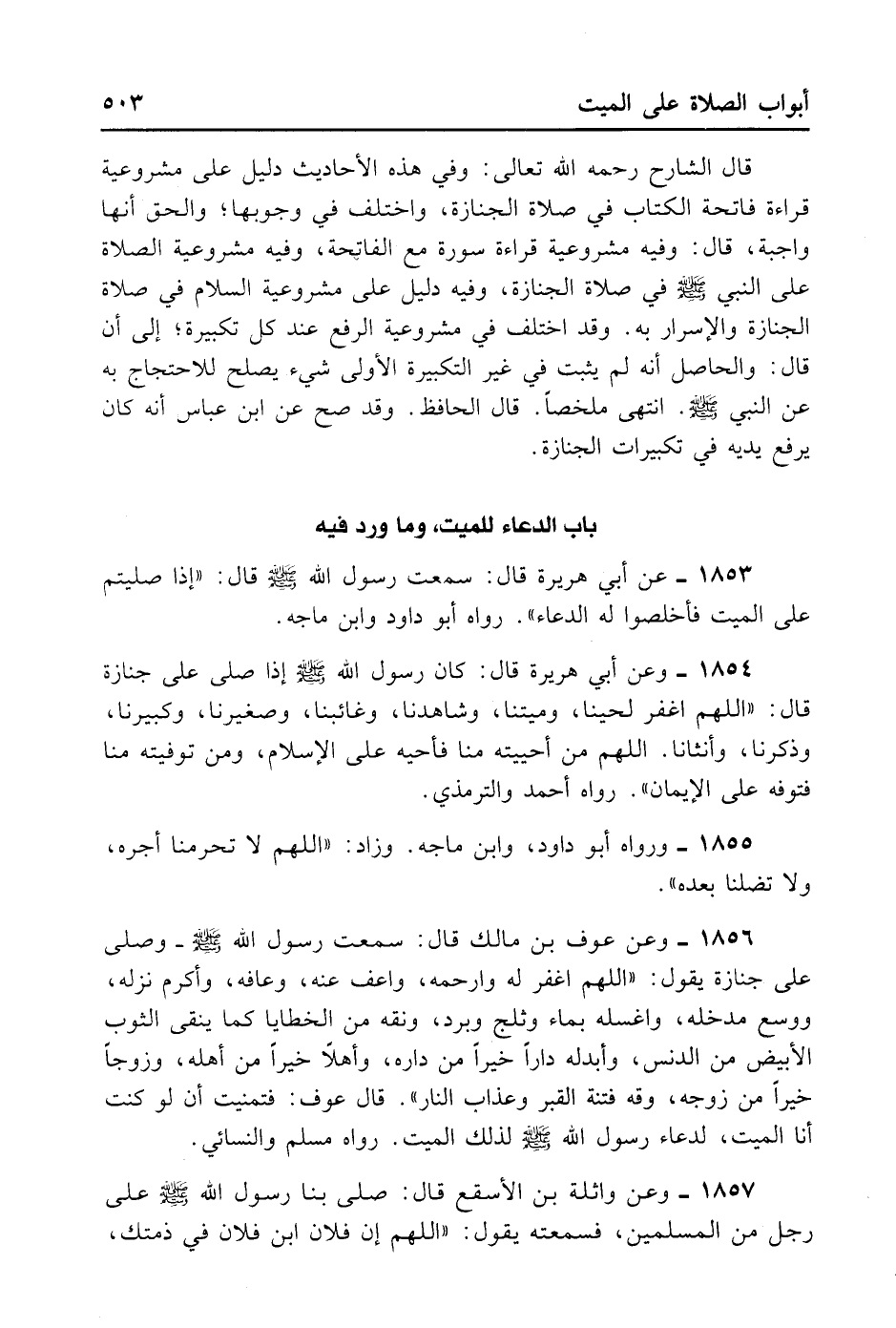 1856- وَعَنْ عَوْفِ بْنِ مَالِكٍ قَالَ: سَمِعْت رَسُولَ اللهِ - صلى الله عليه وسلم - صَلَّى عَلَى جِنَازَةٍ يَقُولُ: «اللَّهُمَّ اغْفِرْ لَهُ وَارْحَمْهُ، وَاعْفُ عَنْهُ وَعَافِهِ وَأَكْرِمْ نُزُلَهُ، وَوَسِّعْ مُدْخَلَهُ، وَاغْسِلْهُ بِمَاءٍ وَثَلْجٍ وَبَرَدٍ، وَنَقِّهِ مِنْ الْخَطَايَا كَمَا يُنَقَّى الثَّوْبُ الْأَبْيَضُ مِنْ الدَّنَسِ، وَأَبْدِلْهُ دَارًا خَيْرًا مِنْ دَارِهِ، وَأَهْلًا خَيْرًا مِنْ أَهْلِهِ، وَزَوْجًا خَيْرًا مِنْ زَوْجِهِ، وَقِه فِتْنَةَ الْقَبْرِ وَعَذَابَ النَّارِ» . قَالَ عَوْفٌ: فَتَمَنَّيْتُ أَنْ لَوْ كُنْتُ أَنَا الْمَيِّتَ لِدُعَاءِ رَسُولِ اللَّهِ - صلى الله عليه وسلم - لِذَلِكَ الْمَيِّتِ. رَوَاهُ مُسْلِمٌ وَالنَّسَائِيُّ.