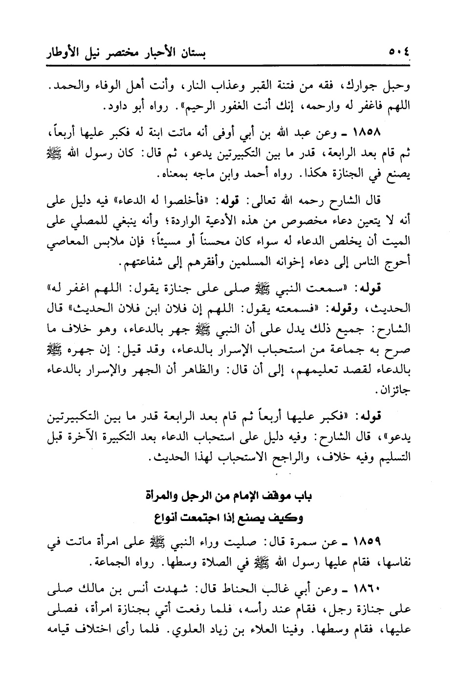 1858- وَعَنْ عَبْدِ اللَّهِ بْنِ أَبِي أَوْفَى أَنَّهُ مَاتَتْ ابْنَةٌ لَهُ، فَكَبَّرَ عَلَيْهَا أَرْبَعًا ثُمَّ قَامَ بَعْدَ الرَّابِعَةِ قَدْرَ مَا بَيْنَ التَّكْبِيرَتَيْنِ يَدْعُو، ثُمَّ قَالَ: كَانَ رَسُولُ اللَّهِ - صلى الله عليه وسلم - يَصْنَعُ فِي الْجِنَازَةِ هَكَذَا. رَوَاهُ أَحْمَدُ وَابْنُ مَاجَهْ بِمَعْنَاهُ.