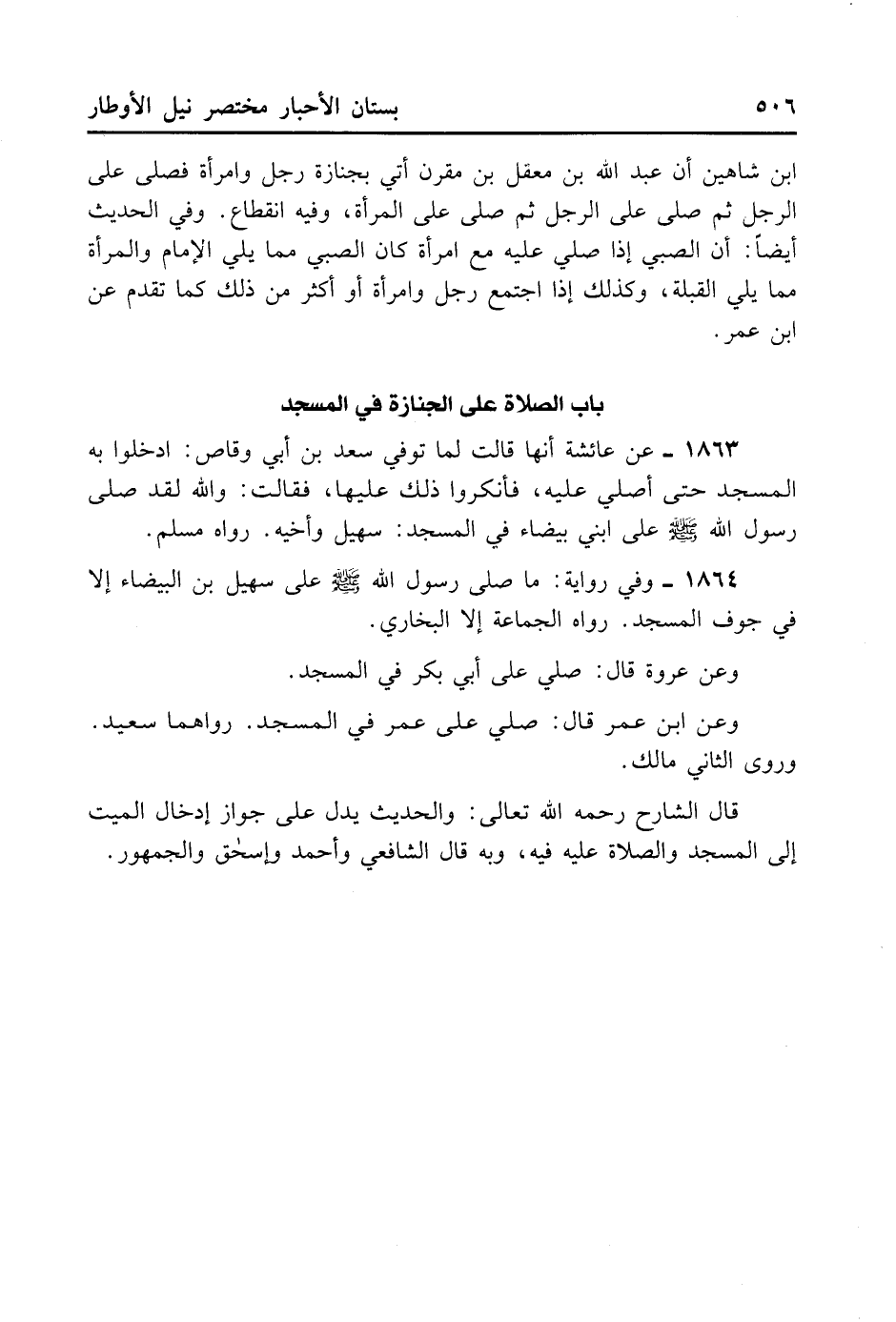 1864- وَفِي رِوَايَةٍ مَا صَلَّى رَسُولُ اللَّهِ - صلى الله عليه وسلم - عَلَى سُهَيْلِ بْنِ الْبَيْضَاءِ إلَّا فِي جَوْفِ الْمَسْجِدِ. رَوَاهُ الْجَمَاعَةُ إلَّا الْبُخَارِيَّ) .