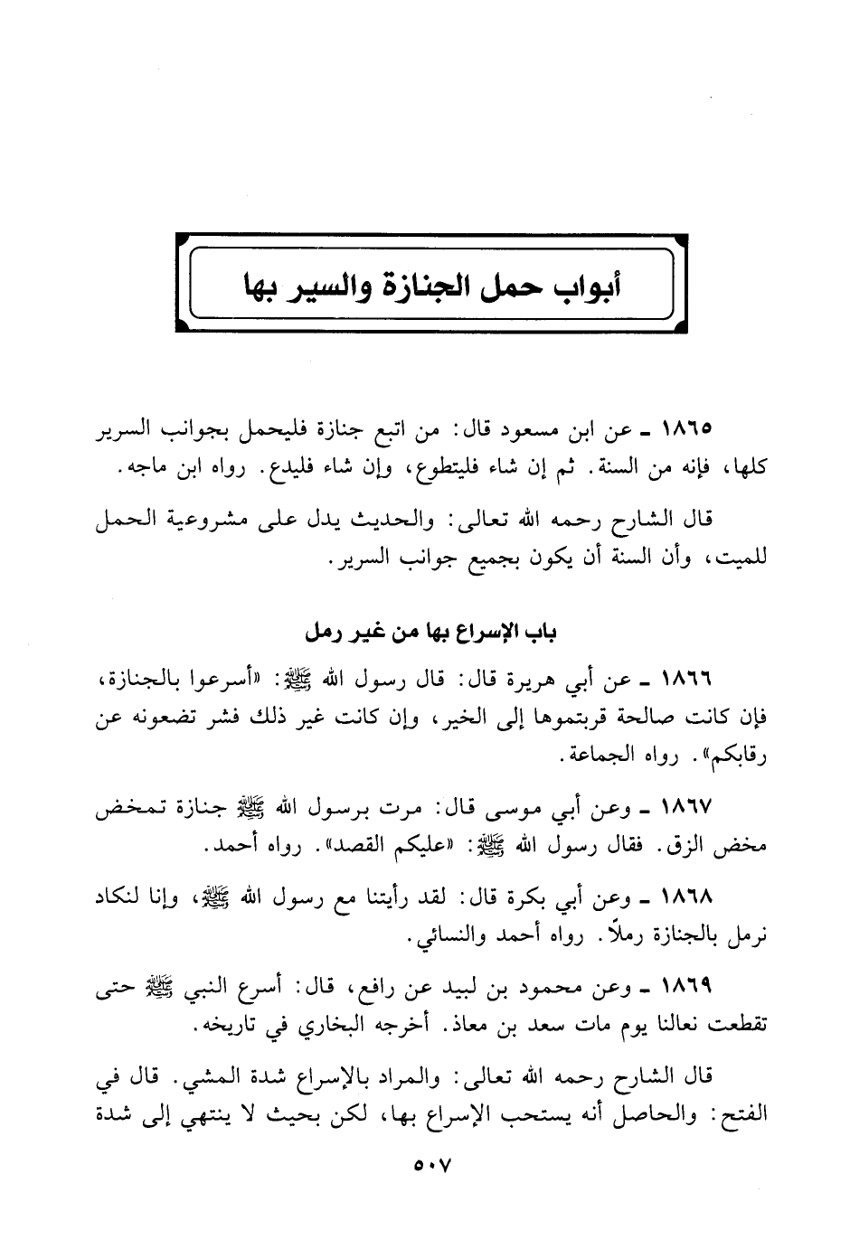 1868- وَعَنْ أَبِي بَكْرَةَ قَالَ: لَقَدْ رَأَيْتُنَا مَعَ رَسُولِ اللَّهِ - صلى الله عليه وسلم - وَإِنَّا لَنَكَادُ نَرْمُلُ بِالْجِنَازَةِ رَمَلًا. رَوَاهُ أَحْمَدُ وَالنَّسَائِيُّ.